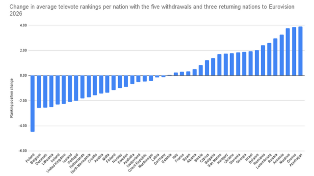 Data showing the change in average rankings from the eight changes to partcipation for Eurovisoin 2026 (Image: Ben Robertson, ESC Insight)