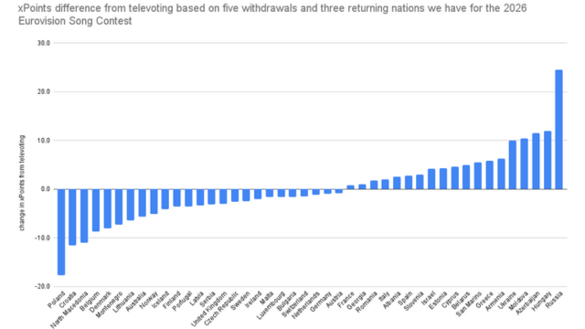 Excluding non-competing nations, Russia and Hungary, our calculations for xP suggest that, at the most extreme example, there is an expected 29-point swing compared to last year’s participating countries in televote score for Poland compared to Azerbaijan. Comfortably enough, if the battle for victory and or qualification was tight between these two nations, that Eurovision history could be changed.