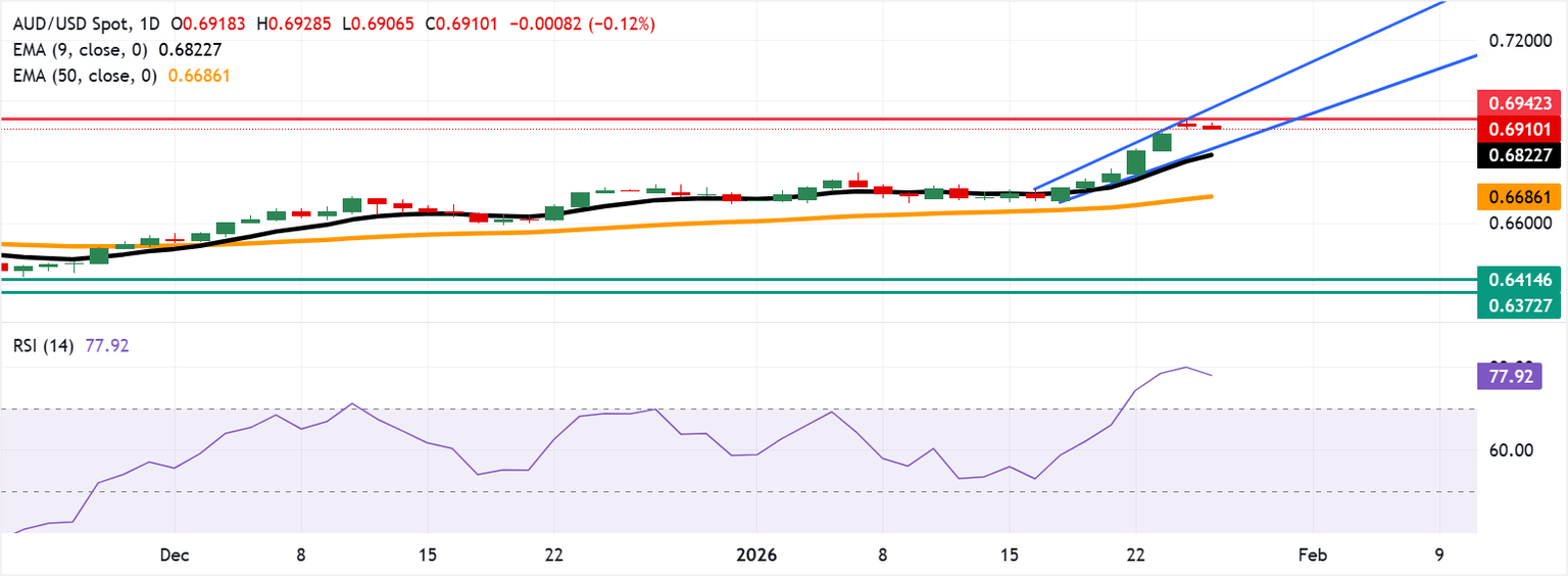 AUD/USD remains subdued for the second successive session, trading around 0.6910 during the European hours on Tuesday. Daily chart analysis indicates that the pair is rising within the ascending channel pattern, indicating a persistent bullish bias.