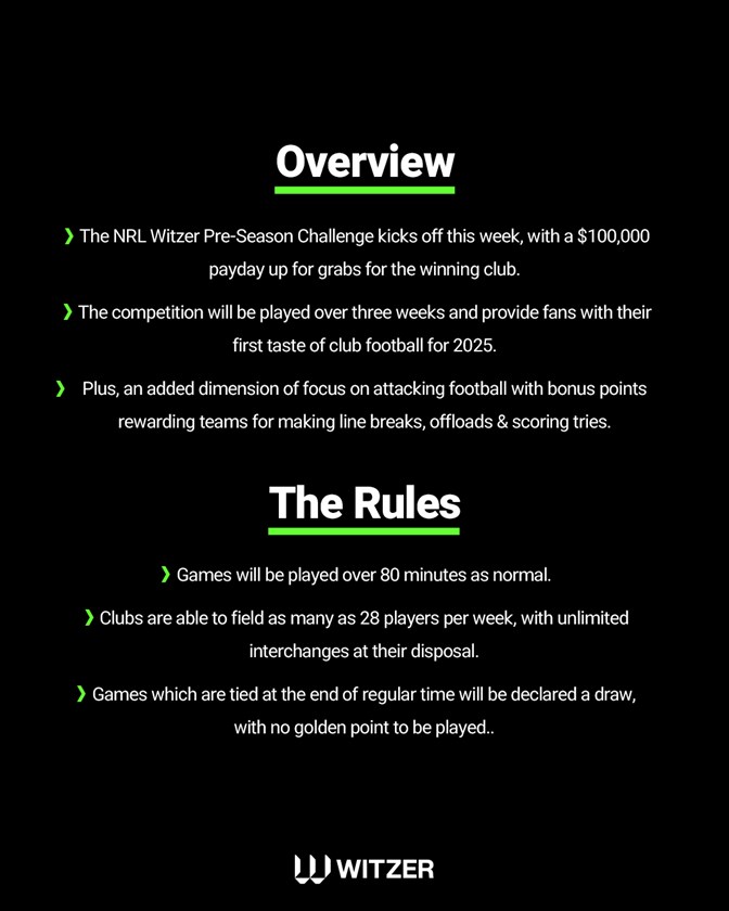The club with the most points at the conclusion of the two rounds will be declared the winner of the Witzer Pre-Season Challenge and claim the $100,000 in prizemoney.