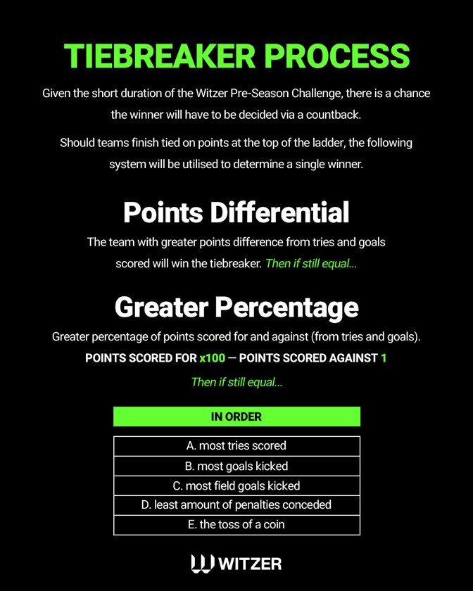 Given the short duration of the Witzer Pre-Season Challenge, there is a good chance the winner will have to be decided via a countback, and the NRL has devised a system to find a winner should teams finish tied on points at the top of the ladder.