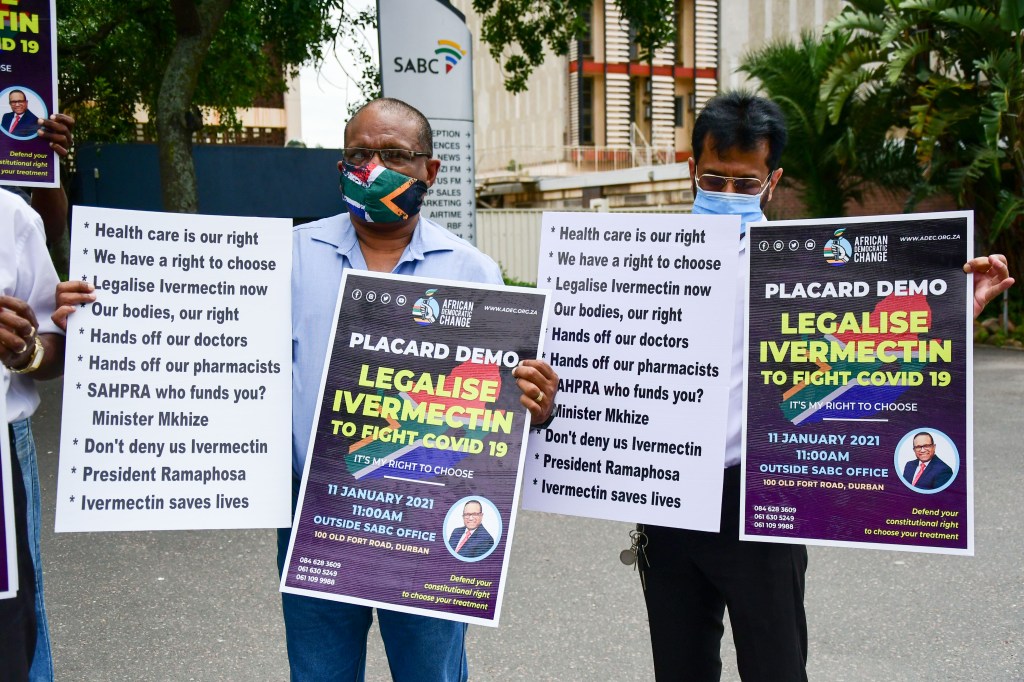 President of the African Democratic Change Party, Visvin Reddy (L) during the Legalise Ivermectin to fight COVID-19 demonstration on January 11, 2021 in Durban, South Africa. (Photo by Darren Stewart/Gallo Images via Getty Images)