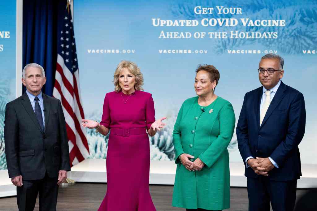 Then-U.S. First Lady Jill Biden (2nd L) speaks about Covid vaccinations alongside Dr. Anthony Fauci (L), White House Chief Medical Advisor and Director of the National Institute of Allergy and Infectious Diseases, AARP CEO Jo Ann Jenkins (2nd R) and White House COVID-19 Response Coordinator Dr. Ashish Jha (R), as they urge Americans to get vaccinated ahead of the holiday season, Dec. 9, 2022. (Photo by SAUL LOEB/AFP via Getty Images)