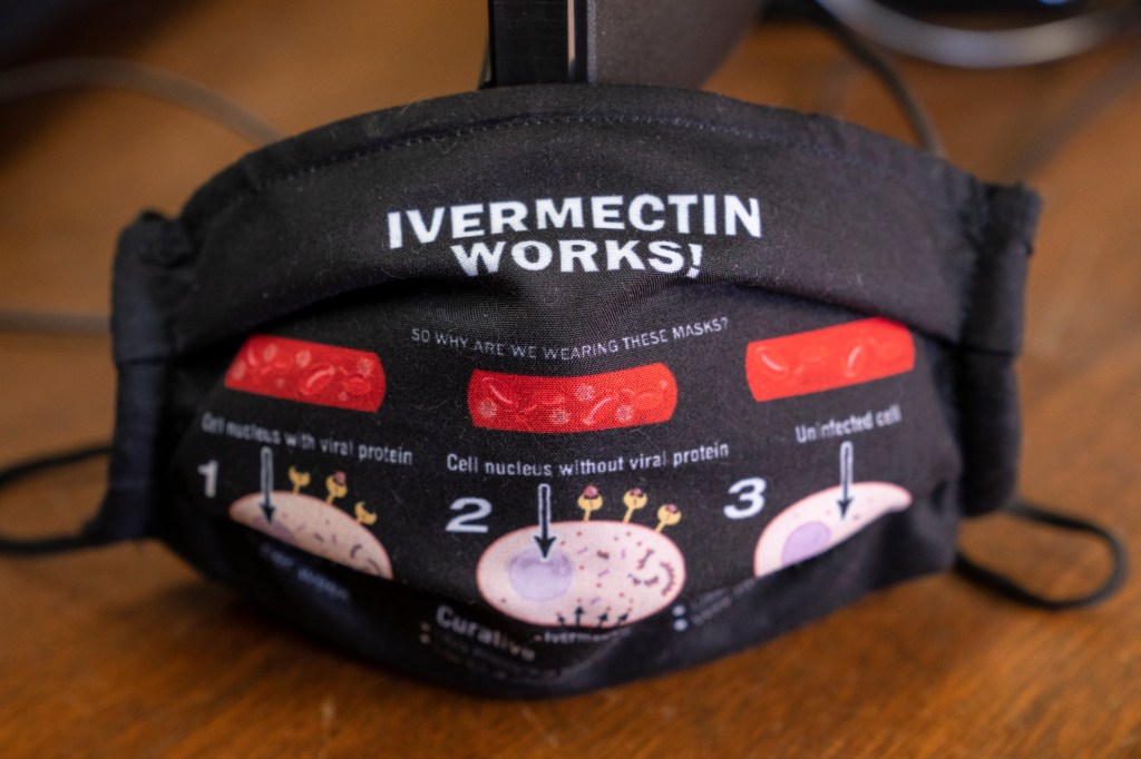 A mask shows support for ivermectin. (Photo by David Ryder for The Washington Post via Getty Images)