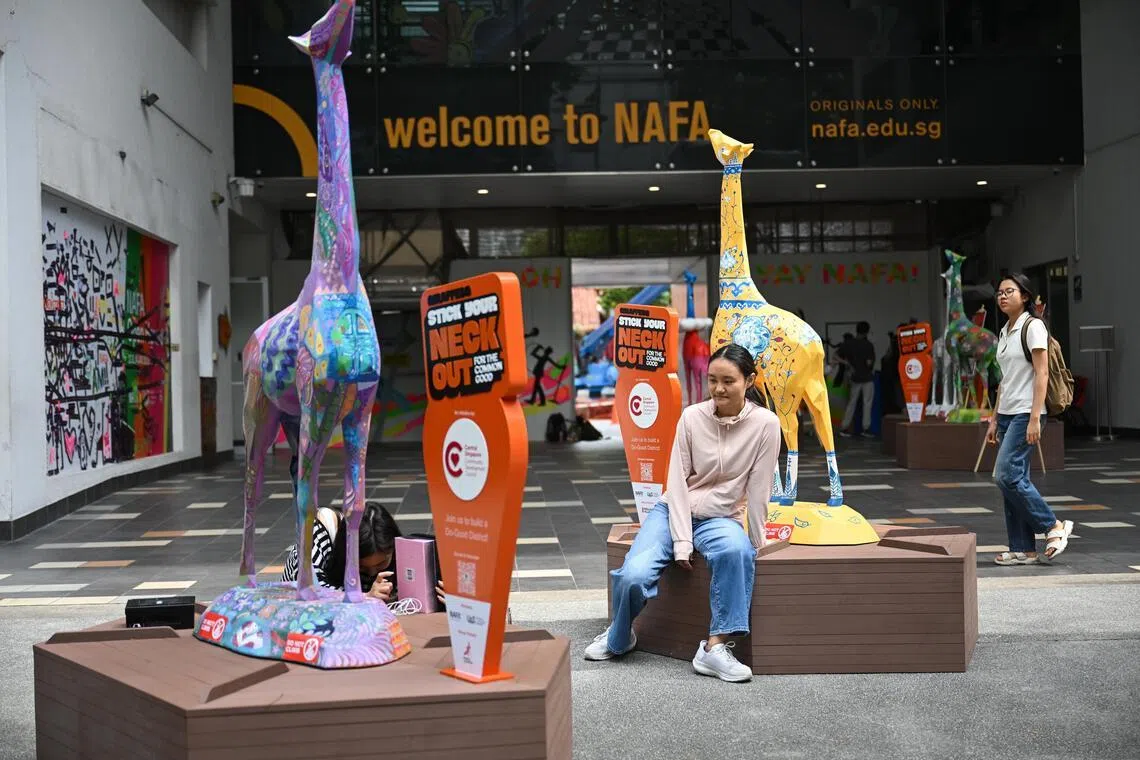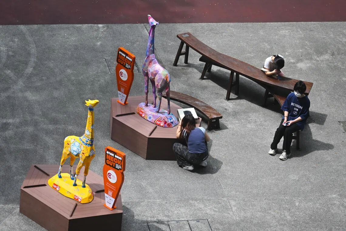 People around the giraffe benches, Roots of Love and The Living Garden, at the NAFA campus in Bugis on Jan 27.