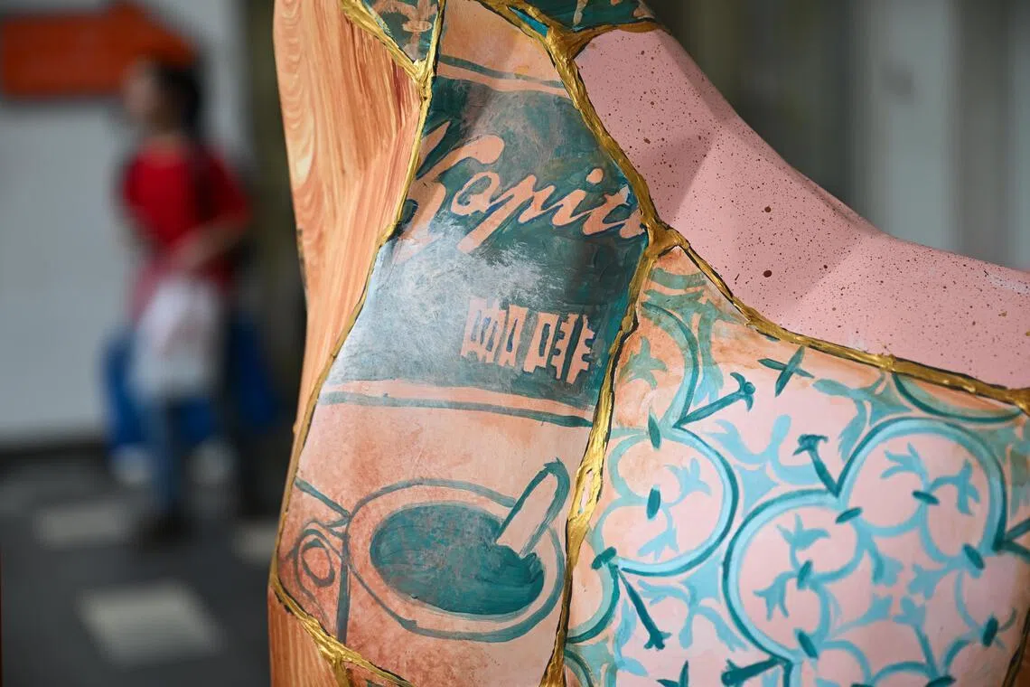 Inspired by traditional coffee shops, artists Nur Iman, 36, and Diamond Nabilah Misson, 22, created Kopi Time, which features Peranakan tiles, tins of condensed milk and worn wooden planks.