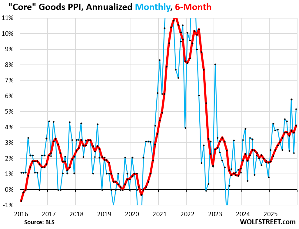 The 6-month average of the overall PPI, which irons out some of the huge ups and downs and gives a better image of the trend, jumped by 4.2%, the second-highest since September 2022, behind only January 2025 (bold red line).