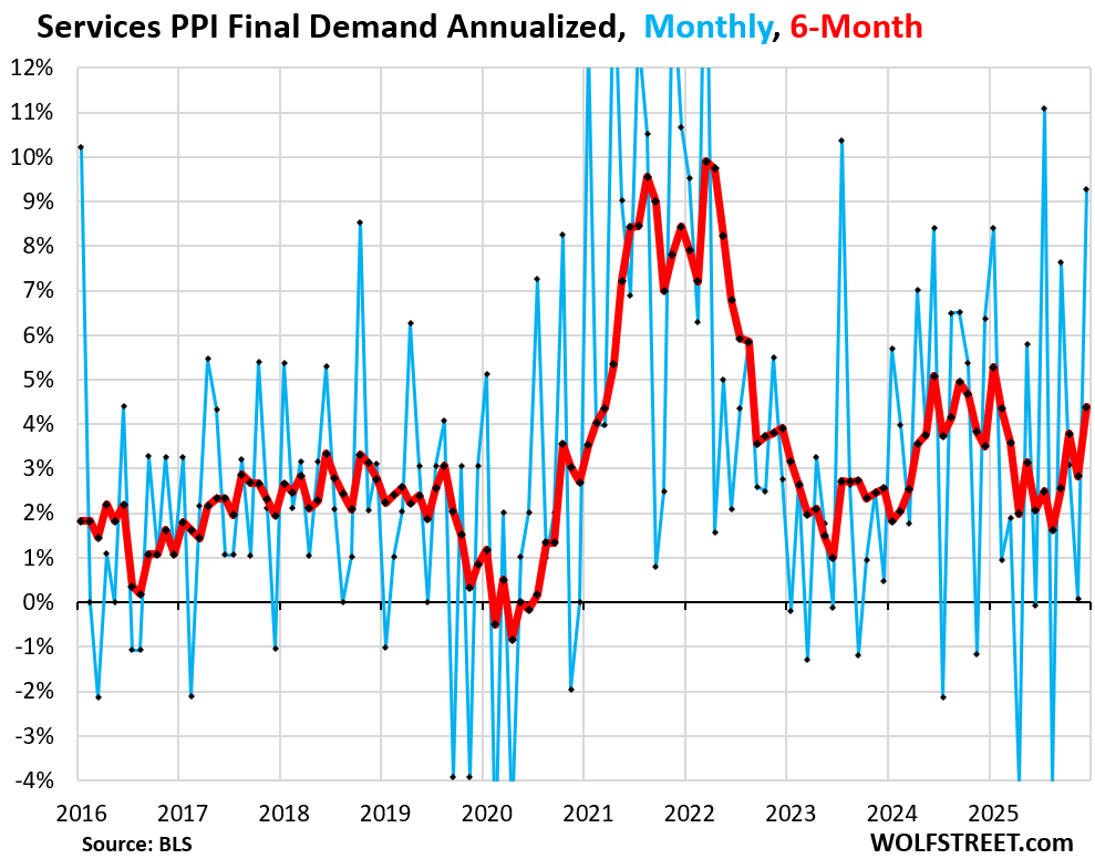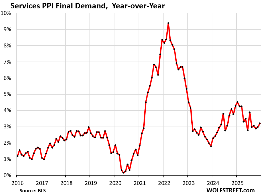 But the services PPI spiked, and services are not tariffed, and they dominate the US economy. The services PPI weighs 68% of the overall PPI. And this big increase is bad news for inflation.