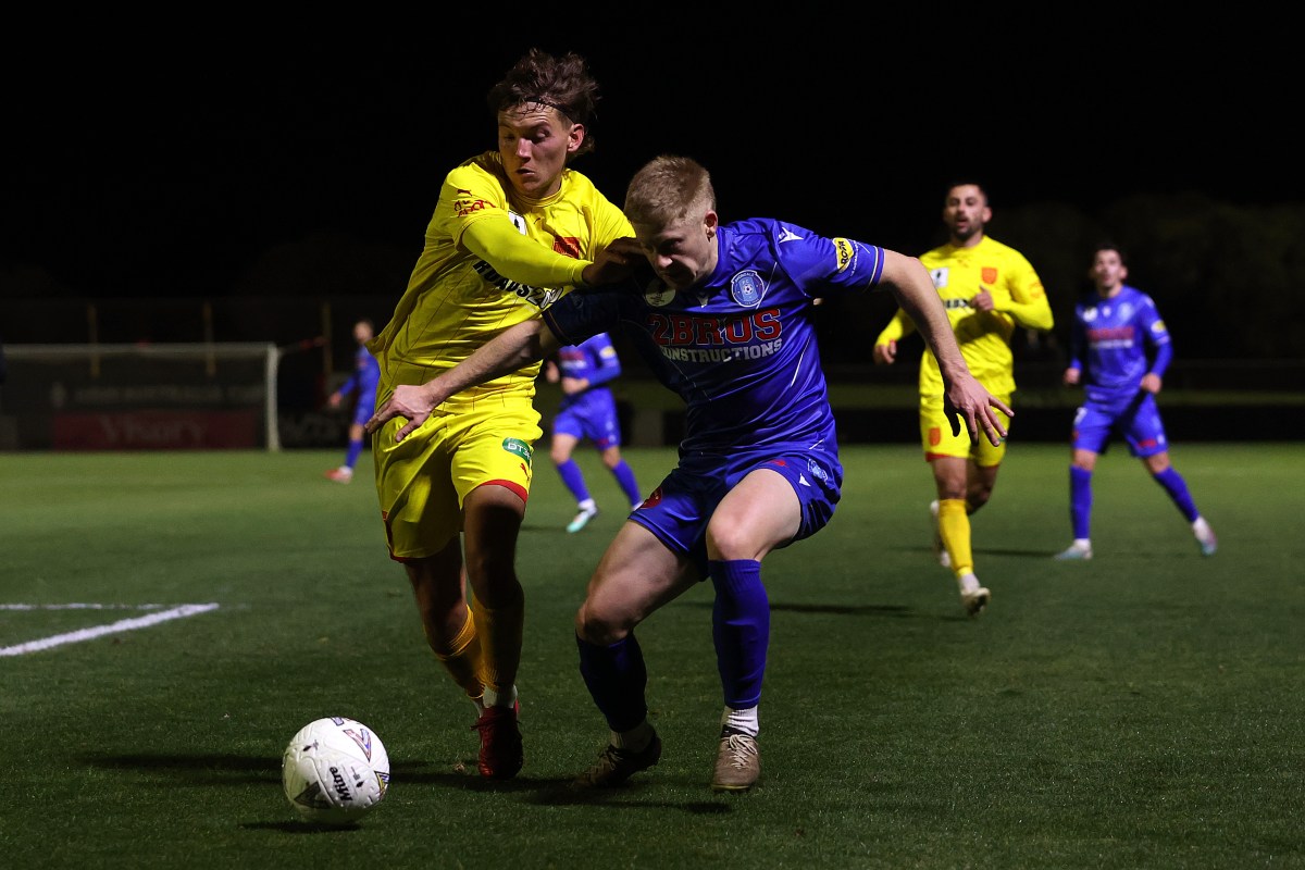 MELBOURNE, AUSTRALIA – JULY 22: Daniel Edwards of Avondale FC and Brent Quick of Stirling Macedonia compete for the ball and during the Australia Cup 2025 Round of 32 match between Avondale FC and Stirling Macedonia FC on July 22, 2025 in Melbourne, Australia. (Photo by Kelly Defina/Getty Images)