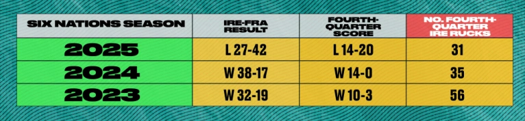 As prime Ireland built more rucks, so they built rhythm into their game and created more clear line-breaking opportunities. Those stats appear even more significant when juxtaposed with a comparison of their fourth quarters versus France over the last three years.
