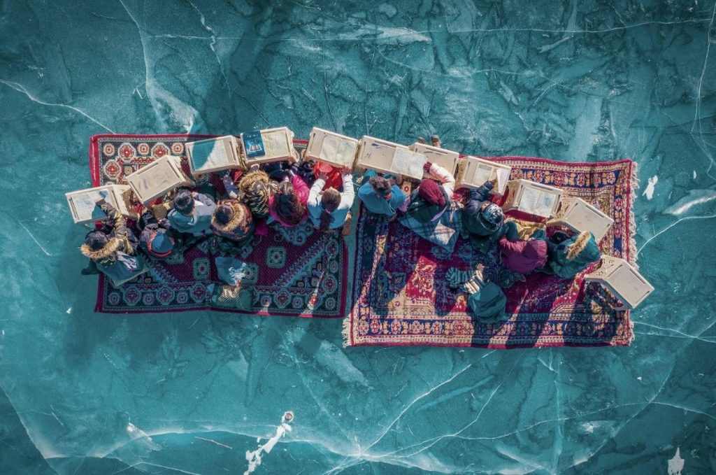 One standout image depicts children studying on the frozen surface of Lake Çıldır in Turkey, where warm human moments clash beautifully with a brutal winter setting. Judges praised the emotional contrast and the way the photo turns nature into an unlikely classroom.