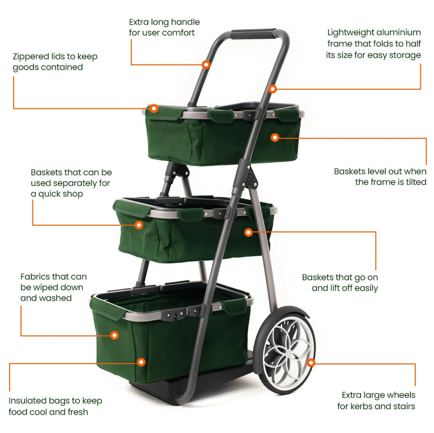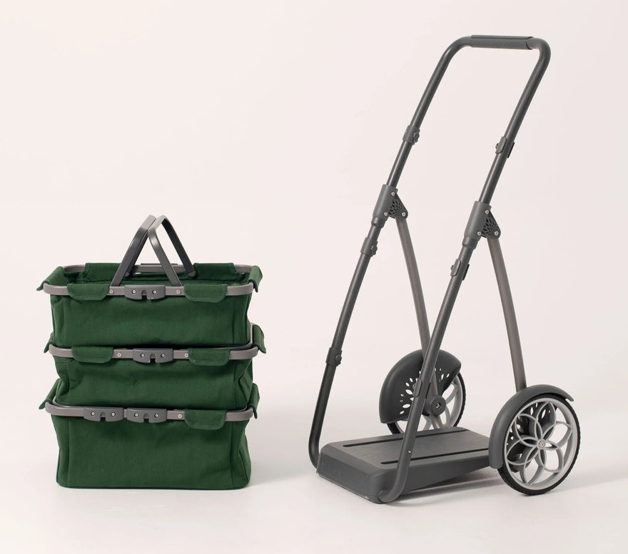 “Big wheels take on curbs and stairs, and the whole cart folds to half its size for convenient storage. One of our favourite features is the gimbal that connects the baskets to the frame. It makes the baskets swing to a horizontal position when the cart is tilted and in motion, so your load doesn’t tip out.”