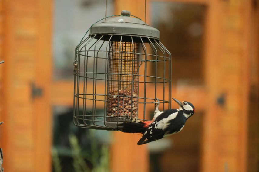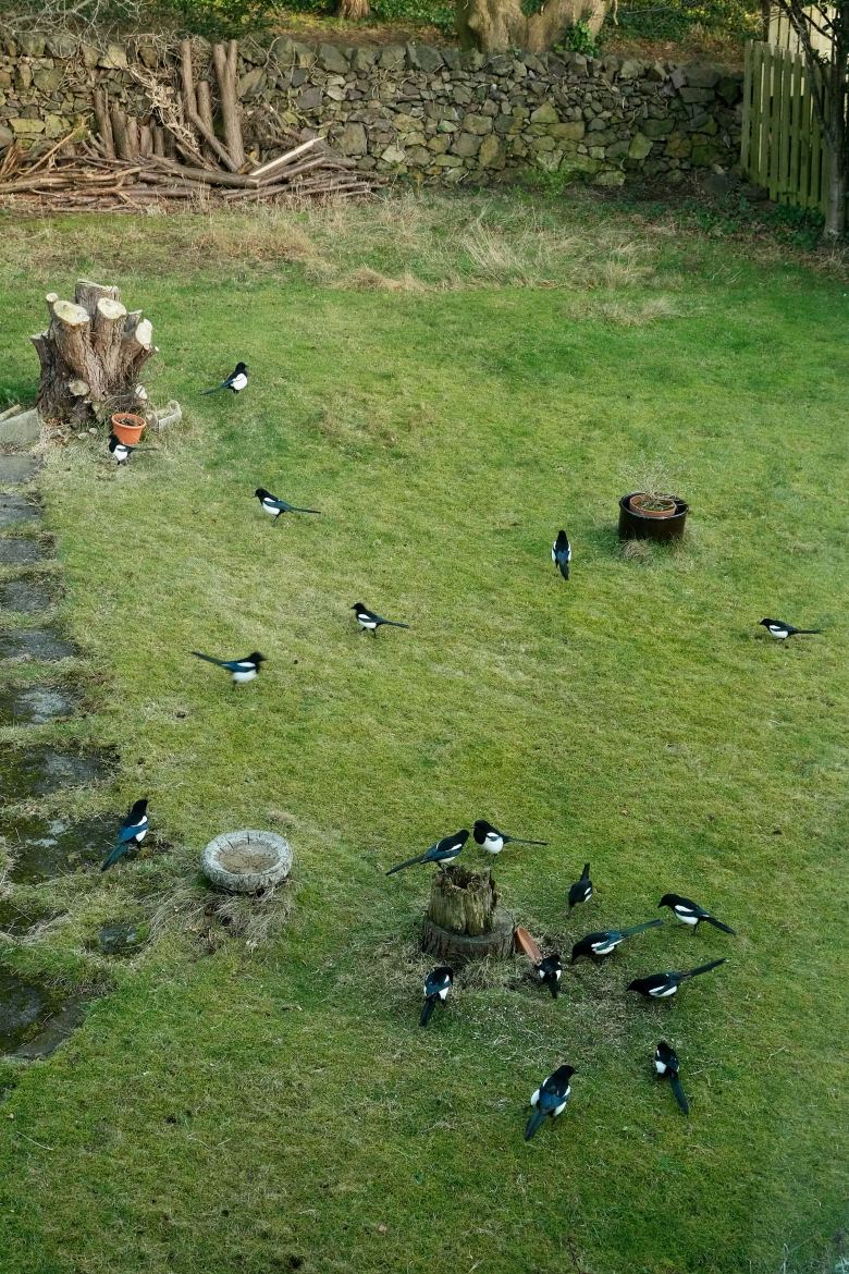 Magpies (Pica pica) come in droves to our garden. They are fascinating to watch but tend to frighten off the songbirds and steal their food: