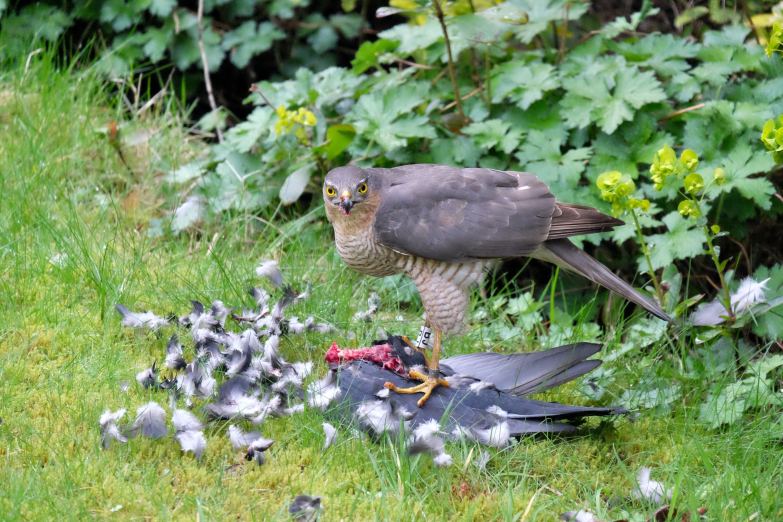 Occasionally we see sparrowhawks (Accipiter nisus) plucking pigeons apart until what is left is small enough to fly away with. The magpies resent the sparrowhawks invading their territory, and gang up against them: