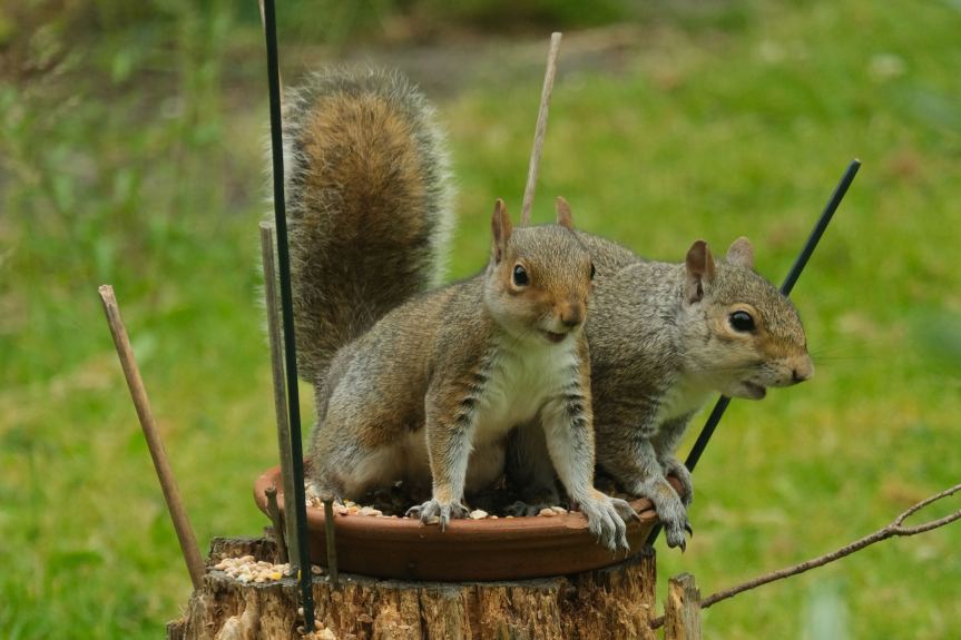 The mammals we see the most are our American friends, the Grey Squirrels (Sciurus carolinensis). They tend to chase ach other away, but these two were friendly, maybe young siblings: