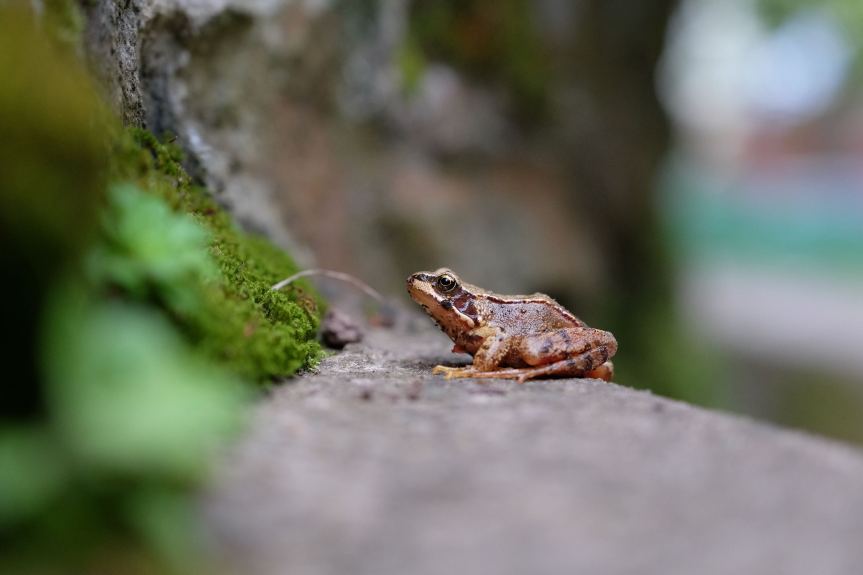We are always surprised to see amphibians because there is not much open water in our neighbourhood. This summer visitor is a Common Frog (Rana temporaria):