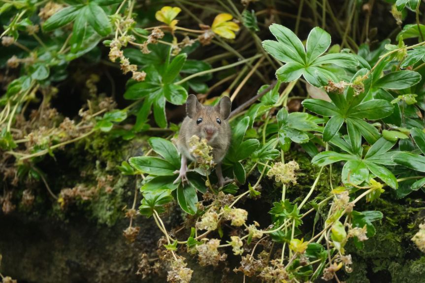 Wood mice (Apodemus sylvaticus) are almost as acrobatic as the squirrels, and we see them climbing up the stems of plants and jumping onto the birdfeeders: