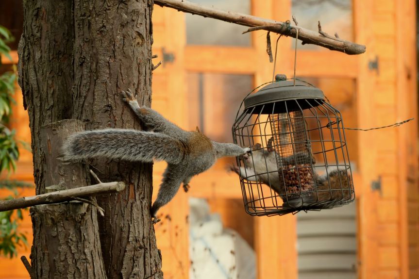 This is the more common behaviour of the Grey Squirrels (Sciurus carolinensis): entering supposedly squirrel-proof birdfeeders and being nasty to each other: