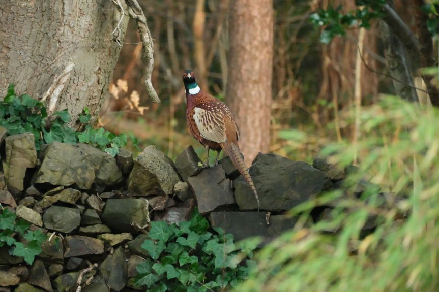 We often see pheasants (Phasianus colchicus) around the golf course one kilometer away, but last November was the first time one came to see us: