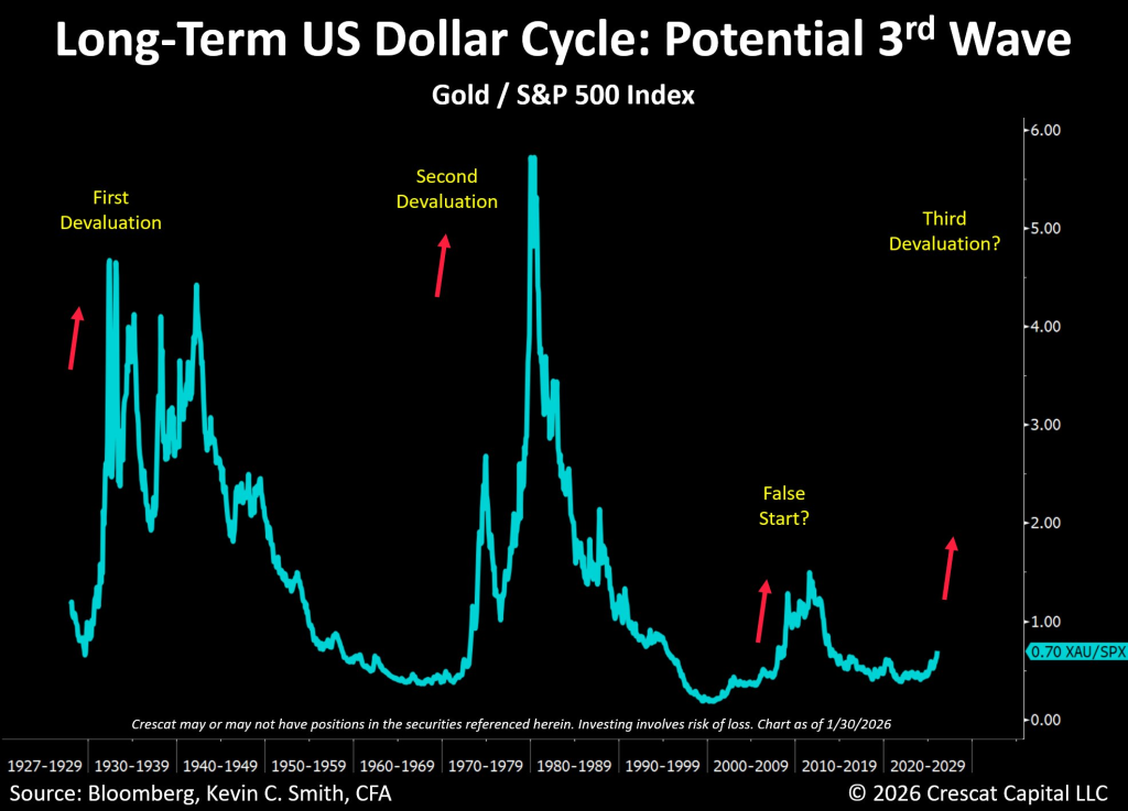 The chart’s implication is that gold’s outperformance versus stocks may be entering an early-stage breakout, similar to prior devaluation cycles.