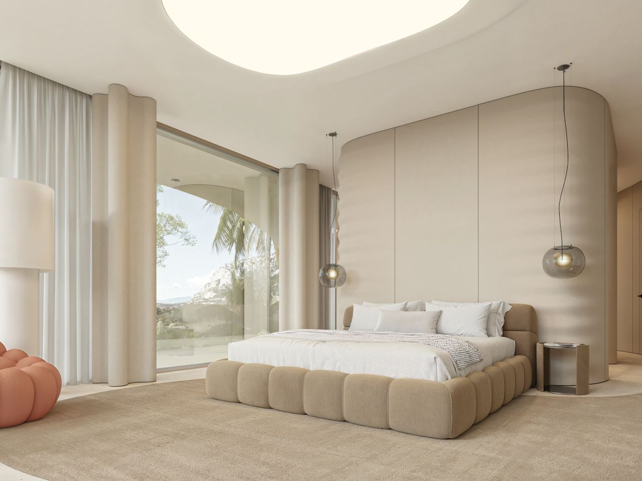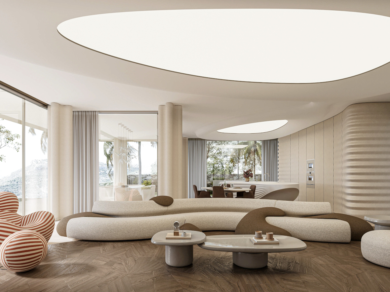 Custom elements, from the sculpted kitchen island to soft, rounded seating and a large ovoid ceiling recess, all follow the same language. Walking from the living area to the dining space, you feel the ceiling dip and rise, the walls tighten and relax, as if the house is breathing slowly. Function stays straightforward, but the form insists on being felt with every step you take through the 400 m² interior.
