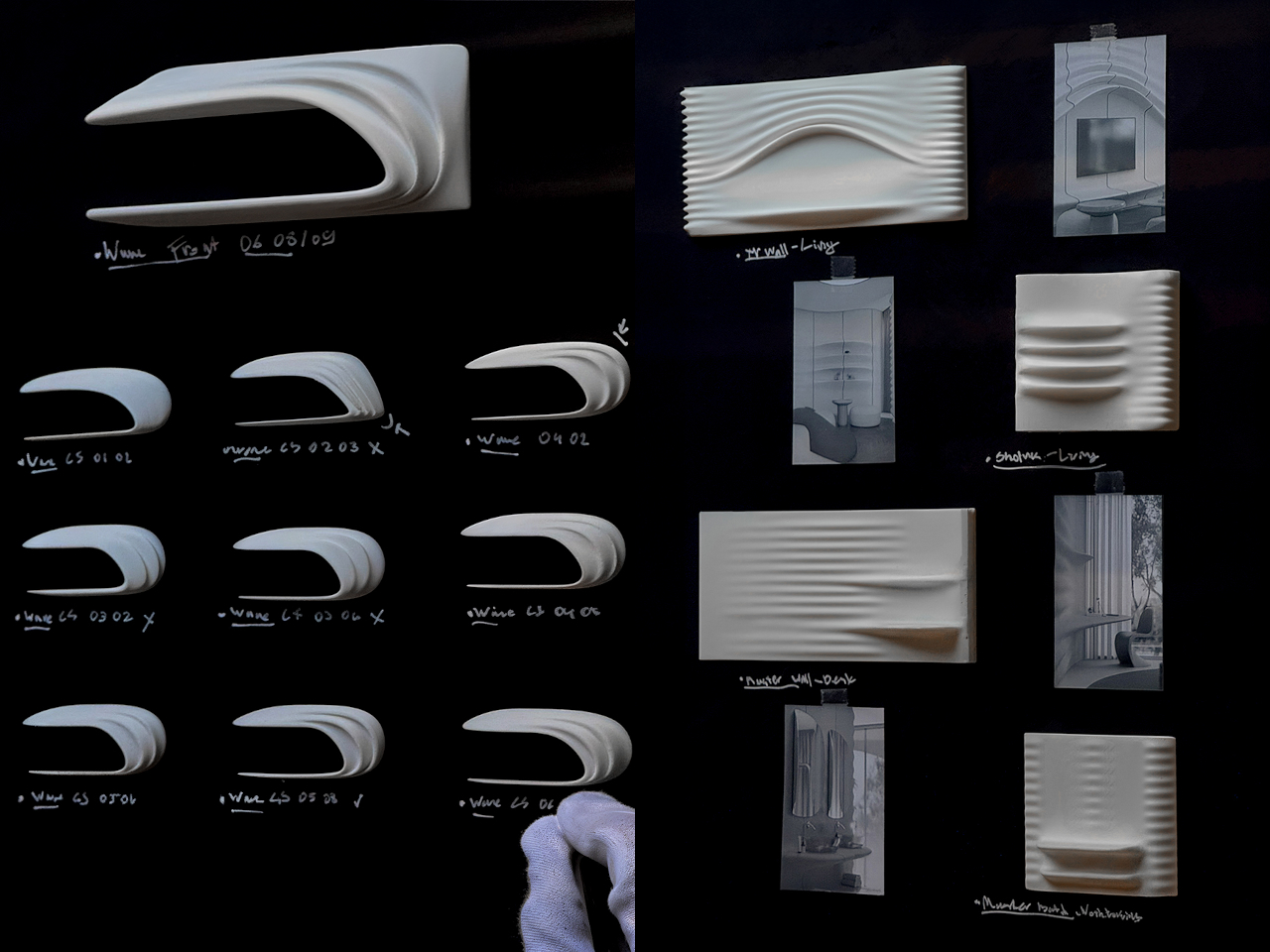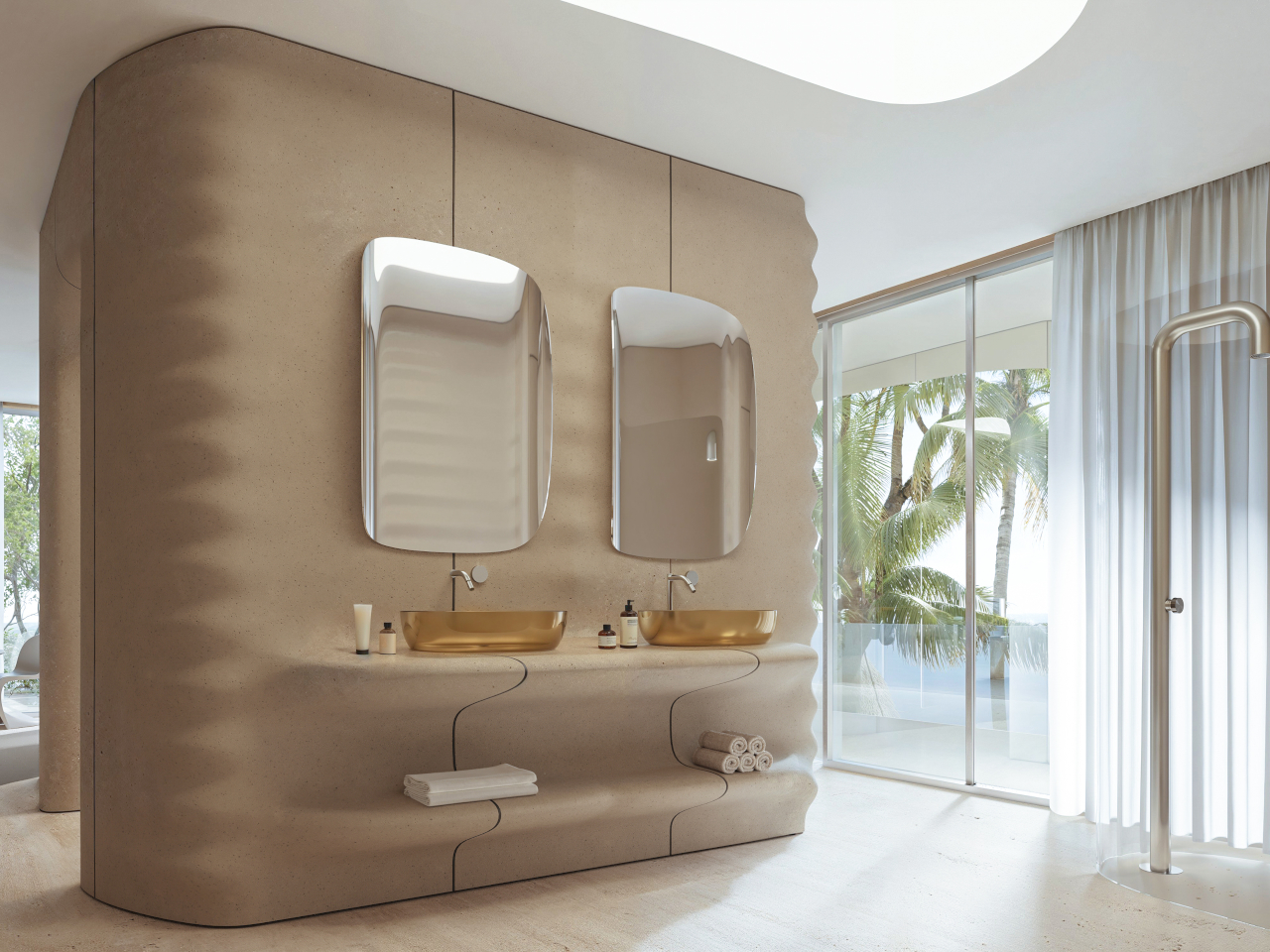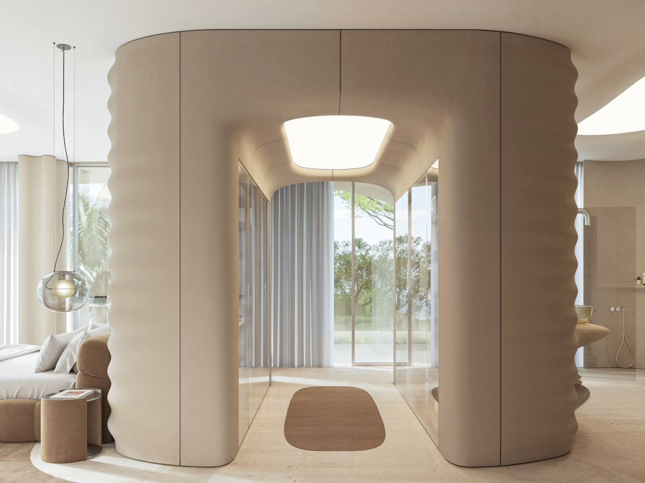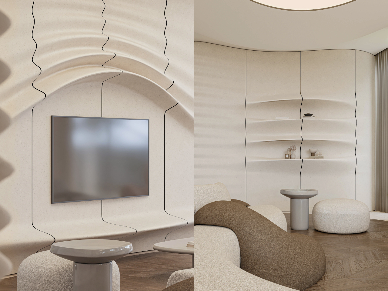 Inside, beige fiber concrete walls pick up the wave metaphor in a quieter way. Flowing parametric lines ripple across surfaces, echoing the exterior geometry without shouting about it. A restrained palette of white, sand, and pale wood keeps visual noise low, letting natural light slide along the curves. Rooms feel connected by a continuous rhythm, more like a tide moving through space than a series of separate boxes.