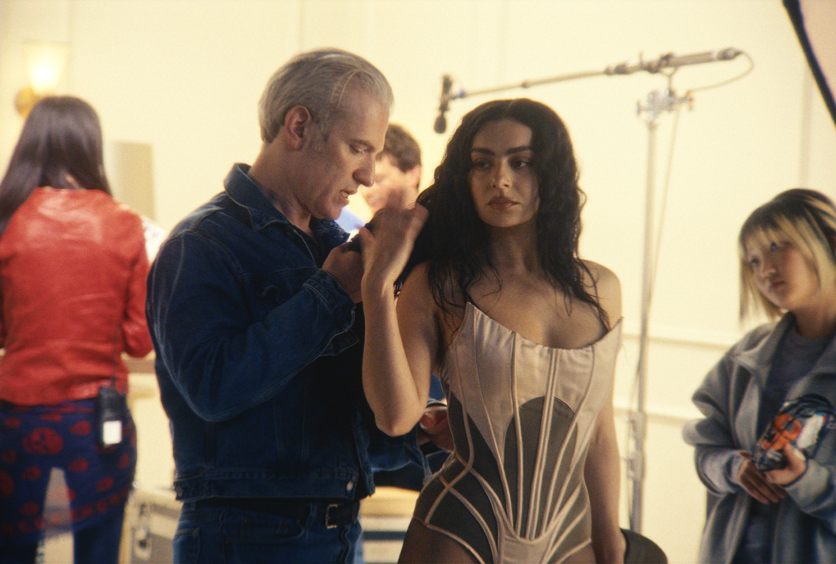 This is all a lot to deal with as it is, but the trouble really begins when Charli reluctantly agrees to do a concert film commemorating her arena tour debut. Charli and her creative director, Celeste (Hailey Benton Gates), have developed a show with strobe lights, live rain and a massive “Brat” curtain — all elements of the real-life tour Charli devised in 2024. But when the label hires famed concert film director Johannes Godwin (Skarsgård) to helm the project, his vision immediately clashes with Celeste and Charli’s. Johannes wants something marketable and safe, a show that the folks at Amazon who have purchased the distribution rights will be happy with. Instead of incessant strobes and Charli clad in a slinky skirt, performing solo with no choreography, Johannes proposes backup dancers, green glitter, high wires and harnesses. “We don’t want families to turn off the television,” he asserts. Vexed, Celeste retorts, “It’s supposed to feel like a club . . . A lot of the people coming to this show don’t even talk to their families.”