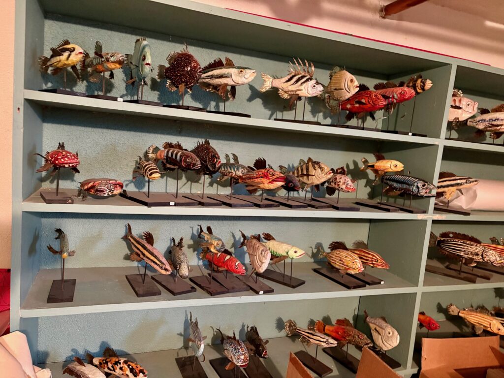 Denver artist Rob Gratiot’s school of hand-carved, oil-painted fish with fins he cut from tin cans. (Colleen Smith/Special to The Denver Gazette)