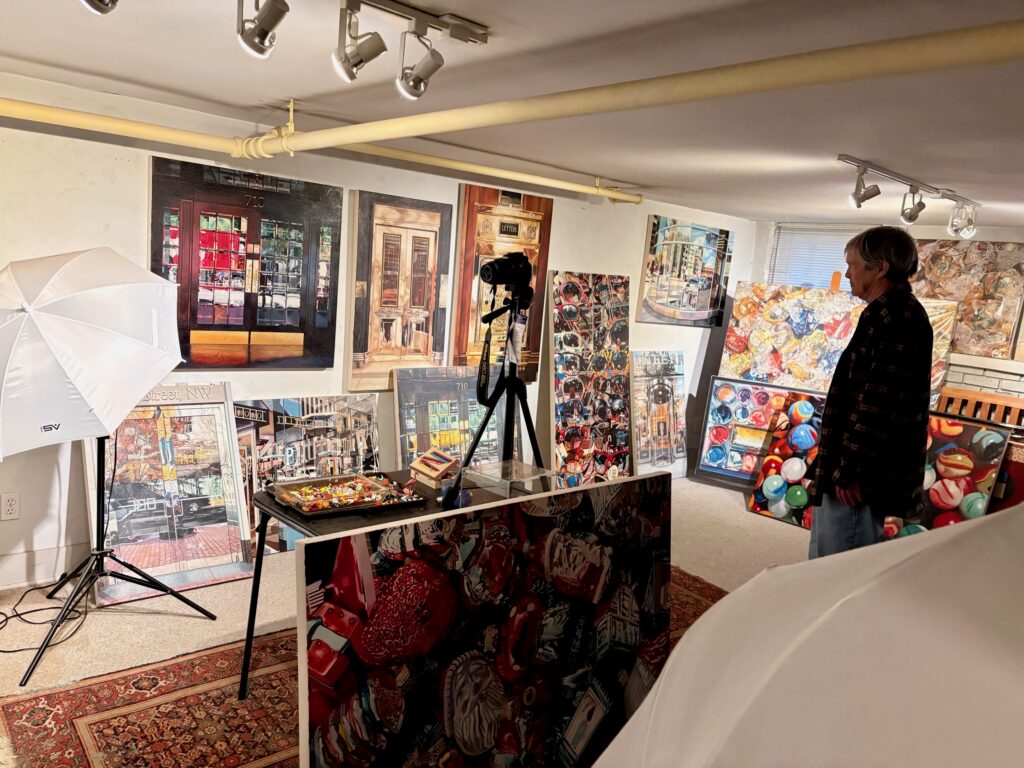 On the other hand, his body of work is bold. As a painter, the artist has most notably demonstrated his zeal for reflections and uncompromising detail. Gratiot has reached the summit of photorealism. He’s serious about his art, yet his subject matter often is playful: candies in reflective wrappers, colorful glass marbles or clusters of tiny toys all rendered on a grand scale and in mind-boggling detail.
