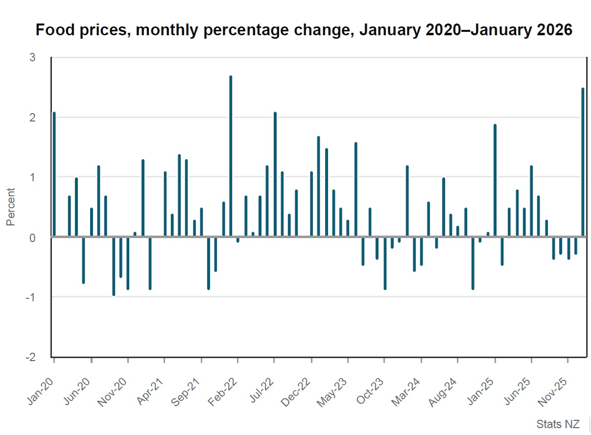 Stats NZ says all food subgroups increased from December 2025 to January 2026.