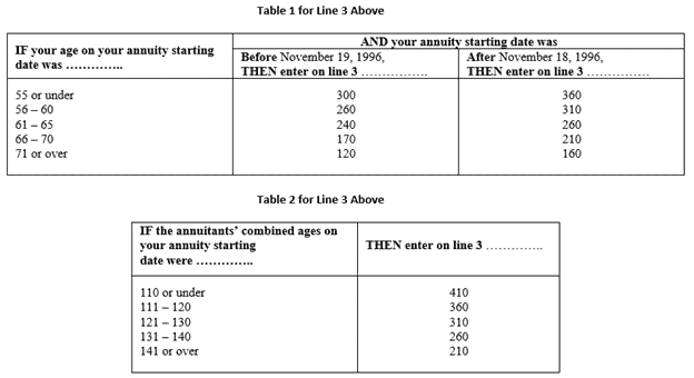 The total monthly exclusion for all survivor annuitants is determined by completing lines 2 through 4 of the Simplified Method Worksheet as if only the surviving spouse is receiving a survivor annuity. In order to calculate the monthly exclusion for each survivor annuitant, the survivor annuitant should multiply the calculated tax-free monthly amount on line 4 of the worksheet by a fraction. For each survivor annuitant (spouse/insurable interest and children) annuitant, the numerator of the fraction is the survivor annuitant’s monthly annuitant’s monthly annuity amount and the denominator of the fraction is the total of the monthly annuity of all the survivor annuitants. The following is an example: