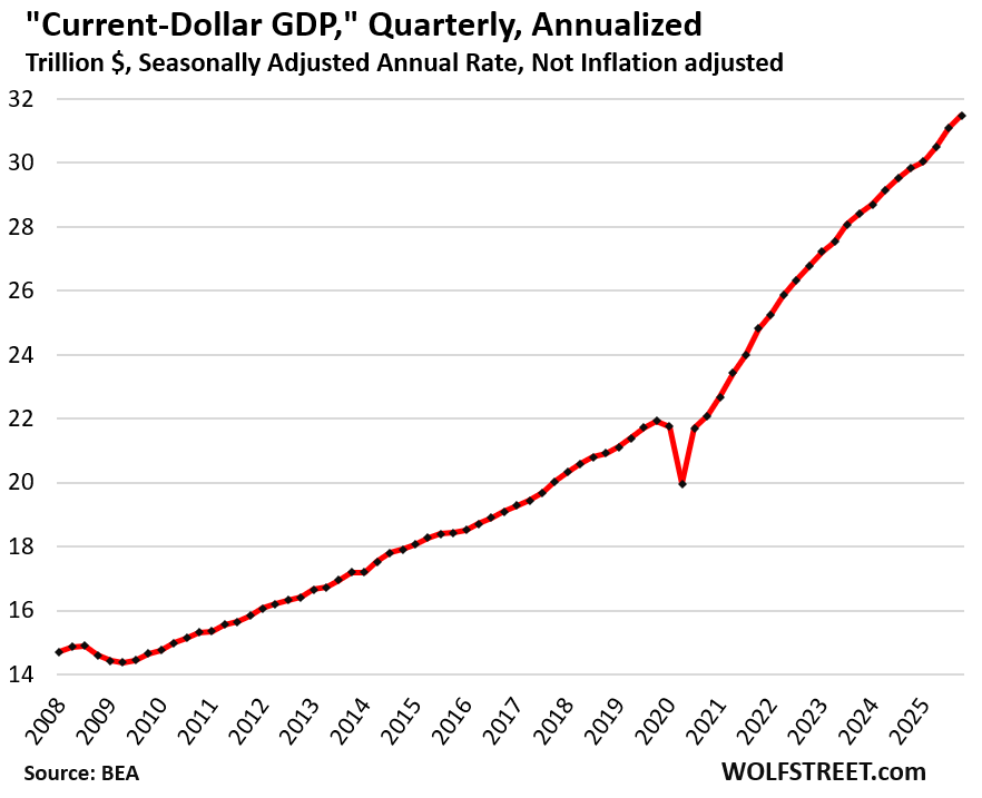 Not adjusted for inflation, “current-dollar GDP” grew by an annual rate of 5.1% to $31.5 trillion, after the 8.3% growth in Q2.