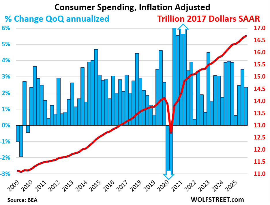 The blue columns show the growth rates (left axis), the red line shows the dollars (right axis), all in seasonally adjusted annual rates (SAAR):