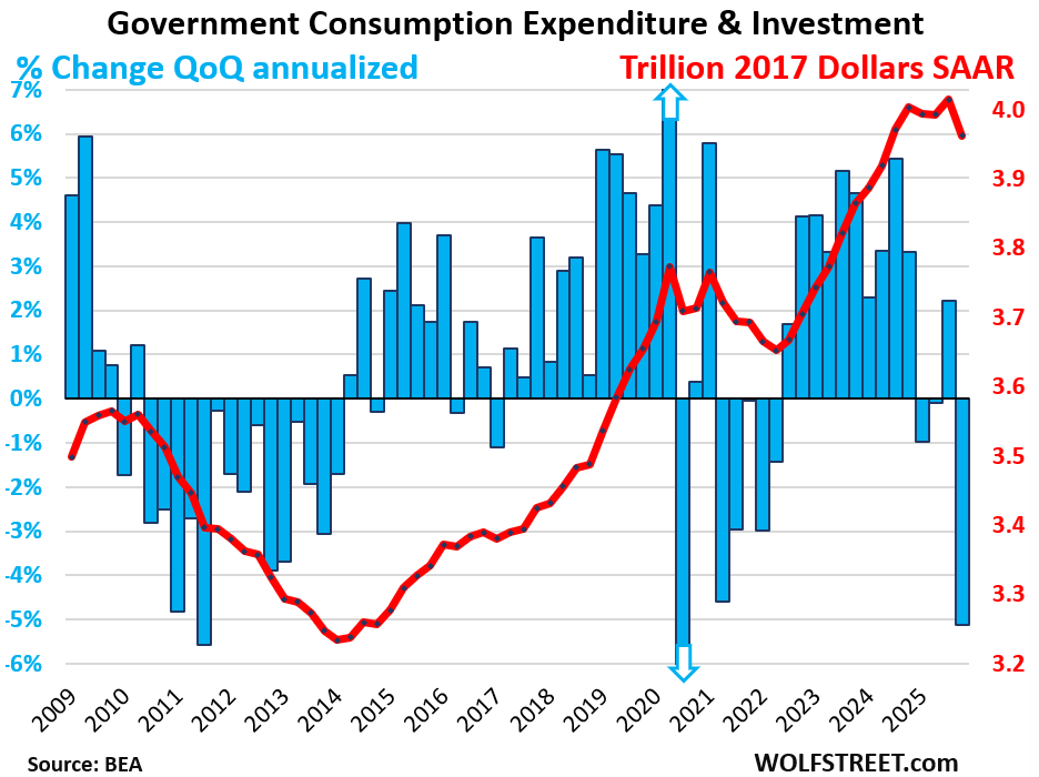 Plunging federal government spending hit real GDP. Government consumption expenditures and gross investment plunged by 16.6% as a result of the longest government shutdown in history: Nondefense spending collapsed by 24.1%. Defense spending plunged by 10.8%.