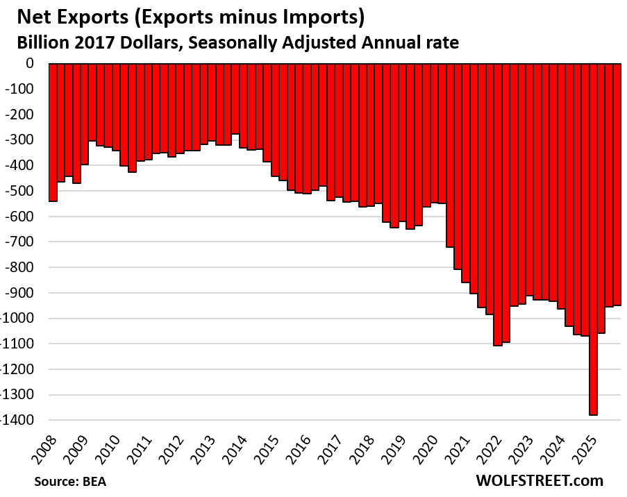 Trade deficit improved and boosted GDP. Net exports (exports minus imports) were the least bad since Q4 2023 and improved by 11% from Q4 a year ago.