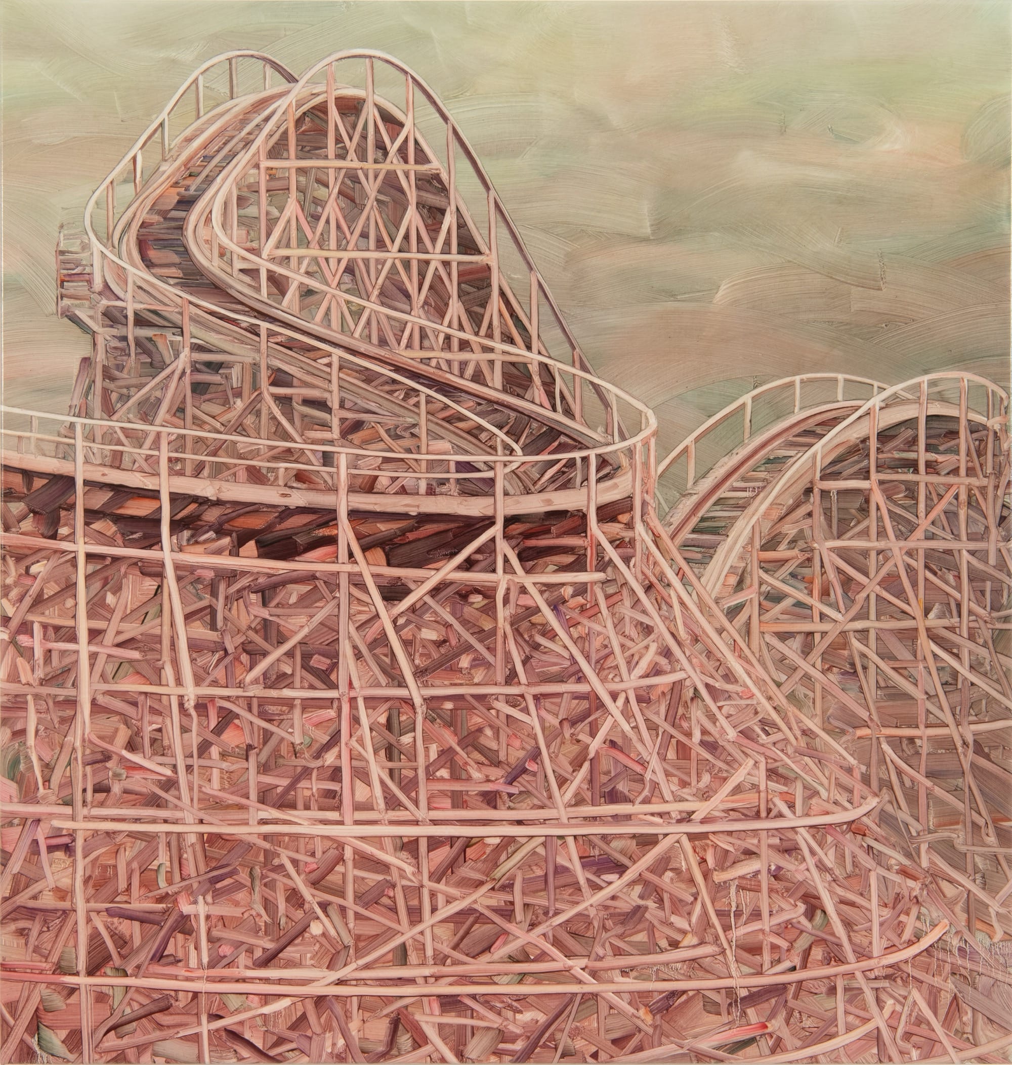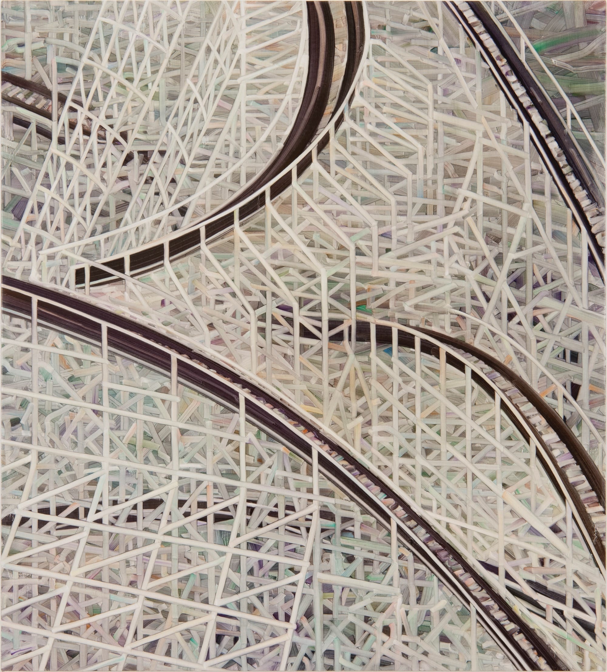 Devoid of the cars that roll along the tracks, Hutton focuses exclusively on volume, line, and three-dimensional grids, also typically setting the undulating forms against blank or brushy backgrounds so that even their scale is disorienting. While we typically associate the rides with youthful energy and nostalgia, the structures are strangely still and stark when pared down to their pure engineering.