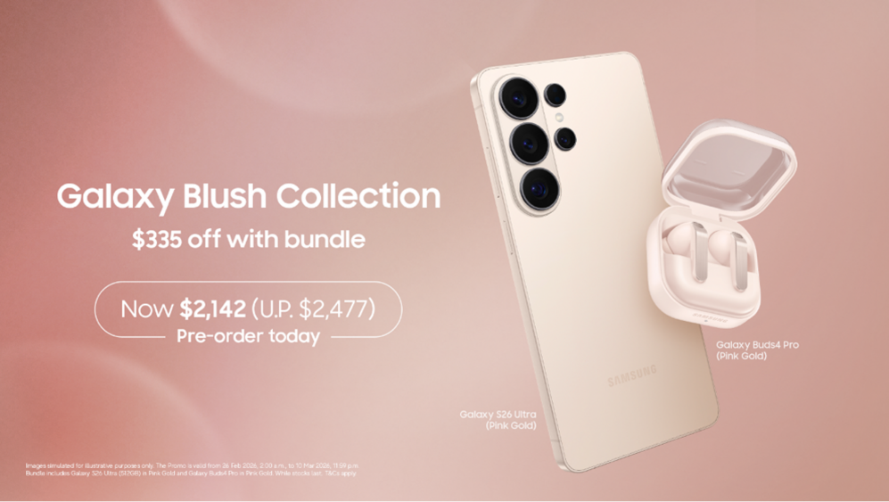 [16]This Promo is valid from 26 February 2026, 2:00AM SGT, to 10 March 2026, 11:59PM SGT. Bundle includes Galaxy S26 Ultra (512GB or 1TB) in Pink Gold and Galaxy Buds4 Pro in Pink Gold. While stocks last. Available for pre-order at Samsung Online Store and Samsung Shop App from 26 February 2026, 2:00AM SGT. The products under this Promo may vary by retail outlet / platform. Samsung reserves the right to amend these Terms and Conditions and/or amend or withdraw this Promo at any time without prior notice and without assigning any reasons.