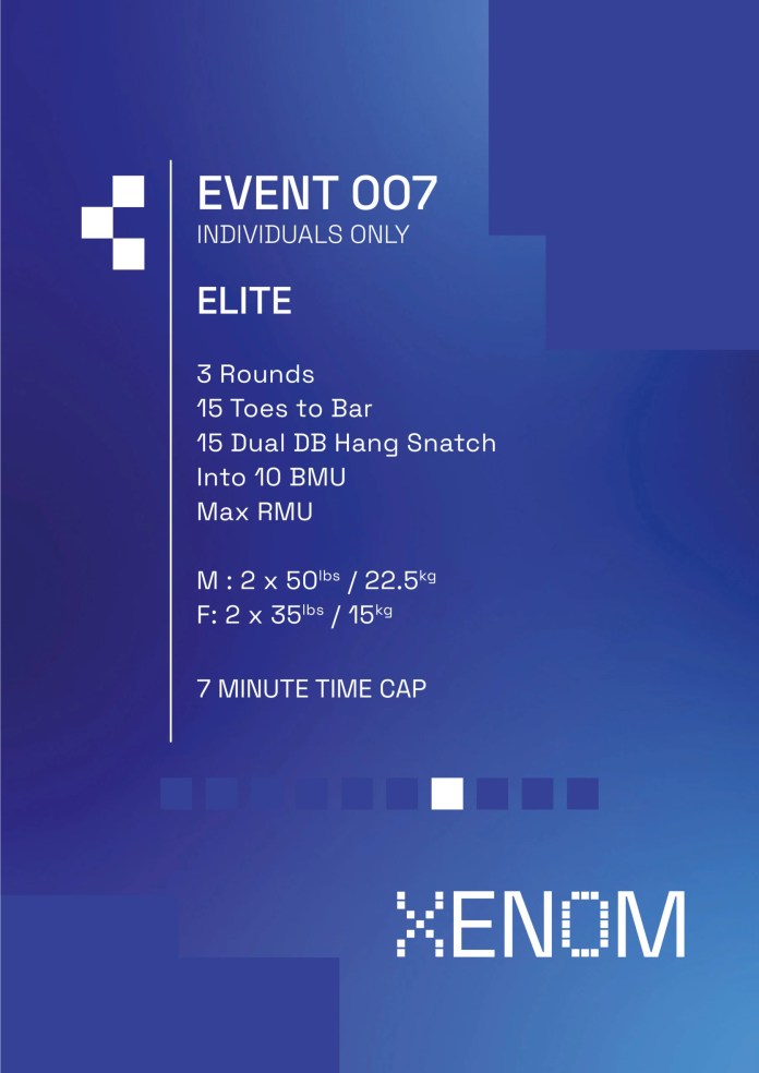 Event 7 is a triplet featuring toes-to-bar, dual dumbbell hang snatch, bar and ring muscle-ups. The elite division workout is outlined below.