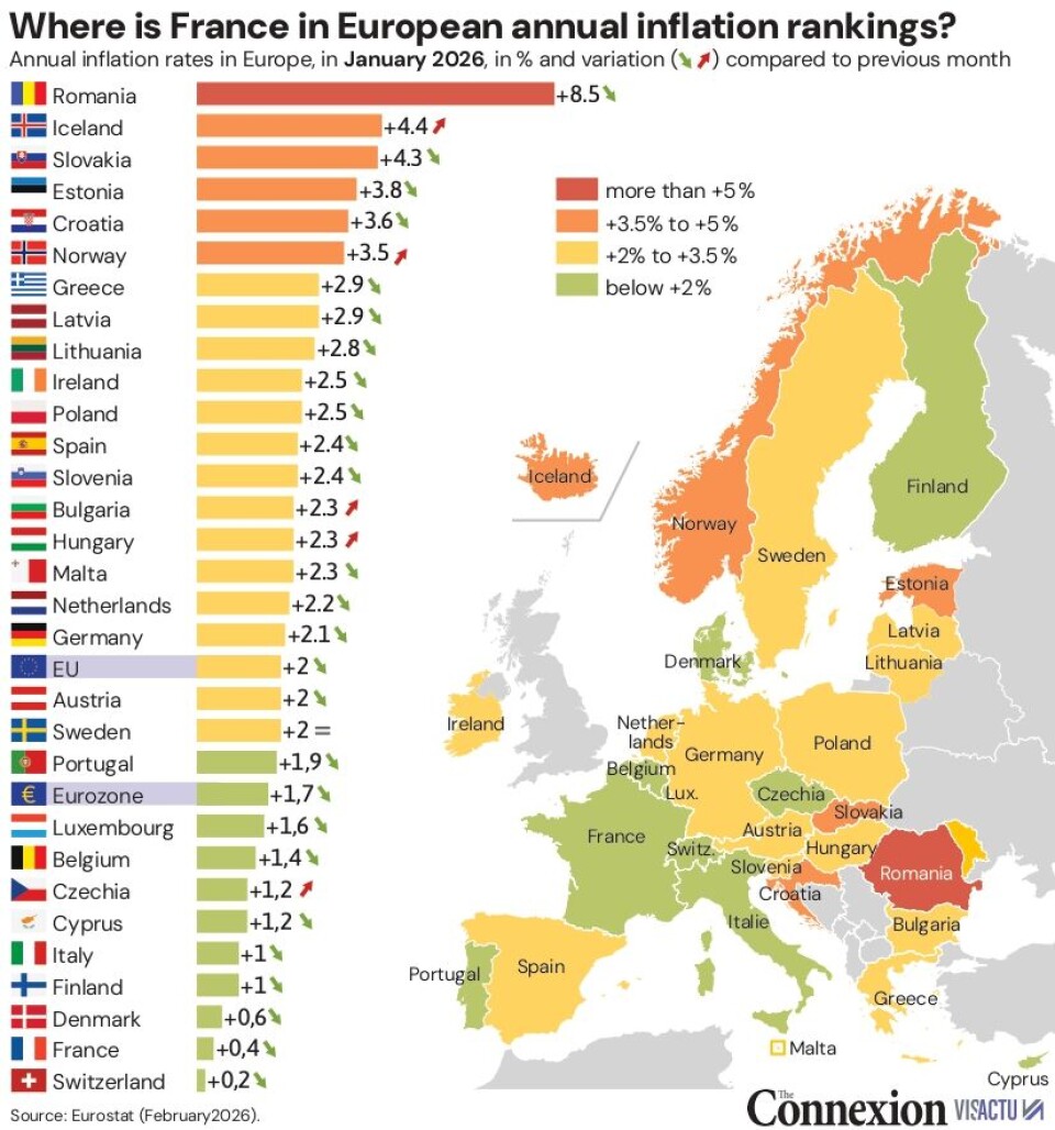 Annual inflation for France in January 2026 stood at +0.4%, the second lowest in Europe behind Switzerland (+0.2%).