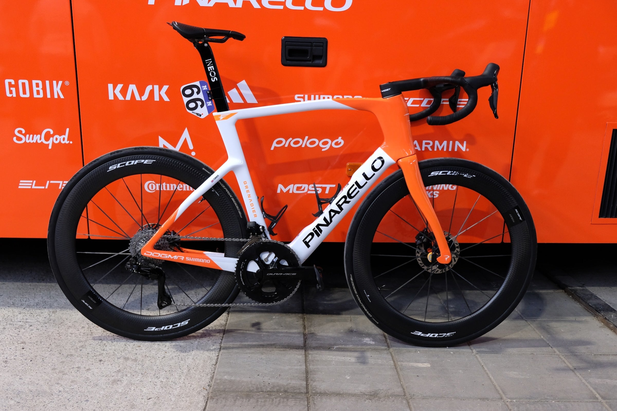 Although INEOS Grenadiers turned to dark bibs for the classics, they stuck to their light colored bike design.