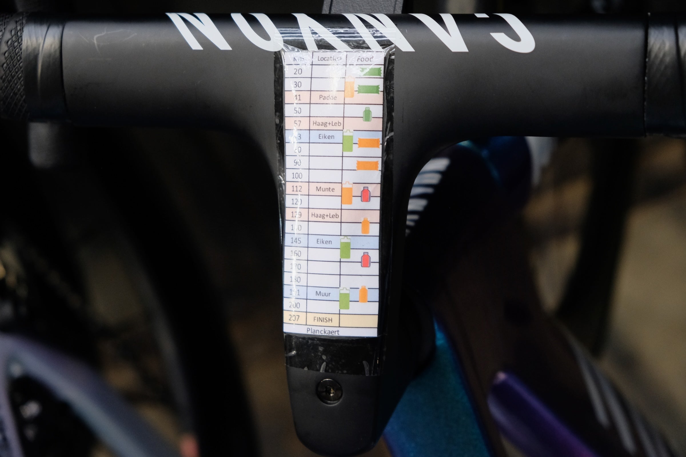 To help riders stick to their nutrition plain, some teams have special stickers which they place on the stem.