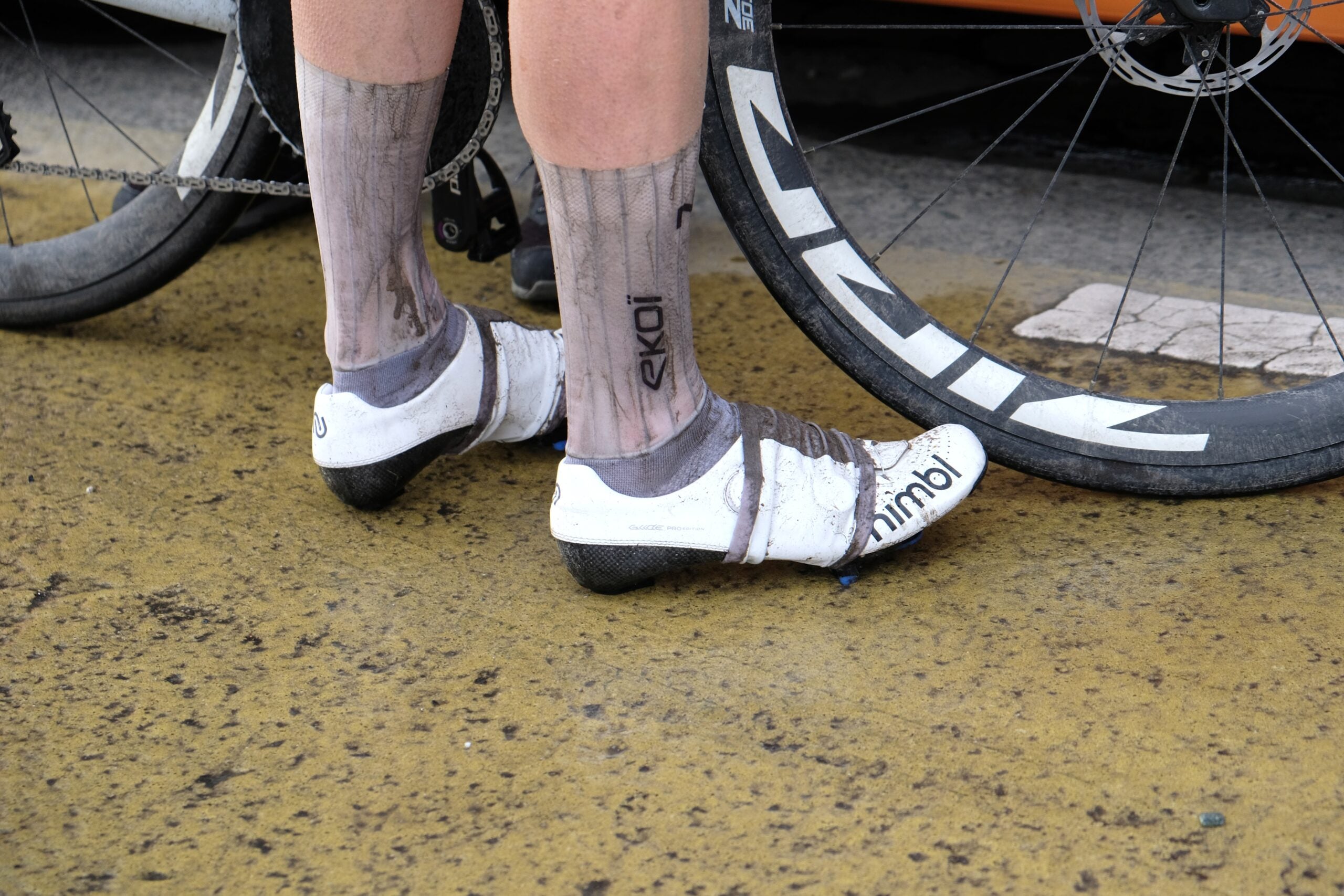 We spotted different riders using aerodynamic overshoes that didn’t cover the entire shoe but instead consisted of two separate parts and left the front of the shoe out in the open. Such as Oliver Naesen, whose white overshoes were not that white anymore after a crash during the race.