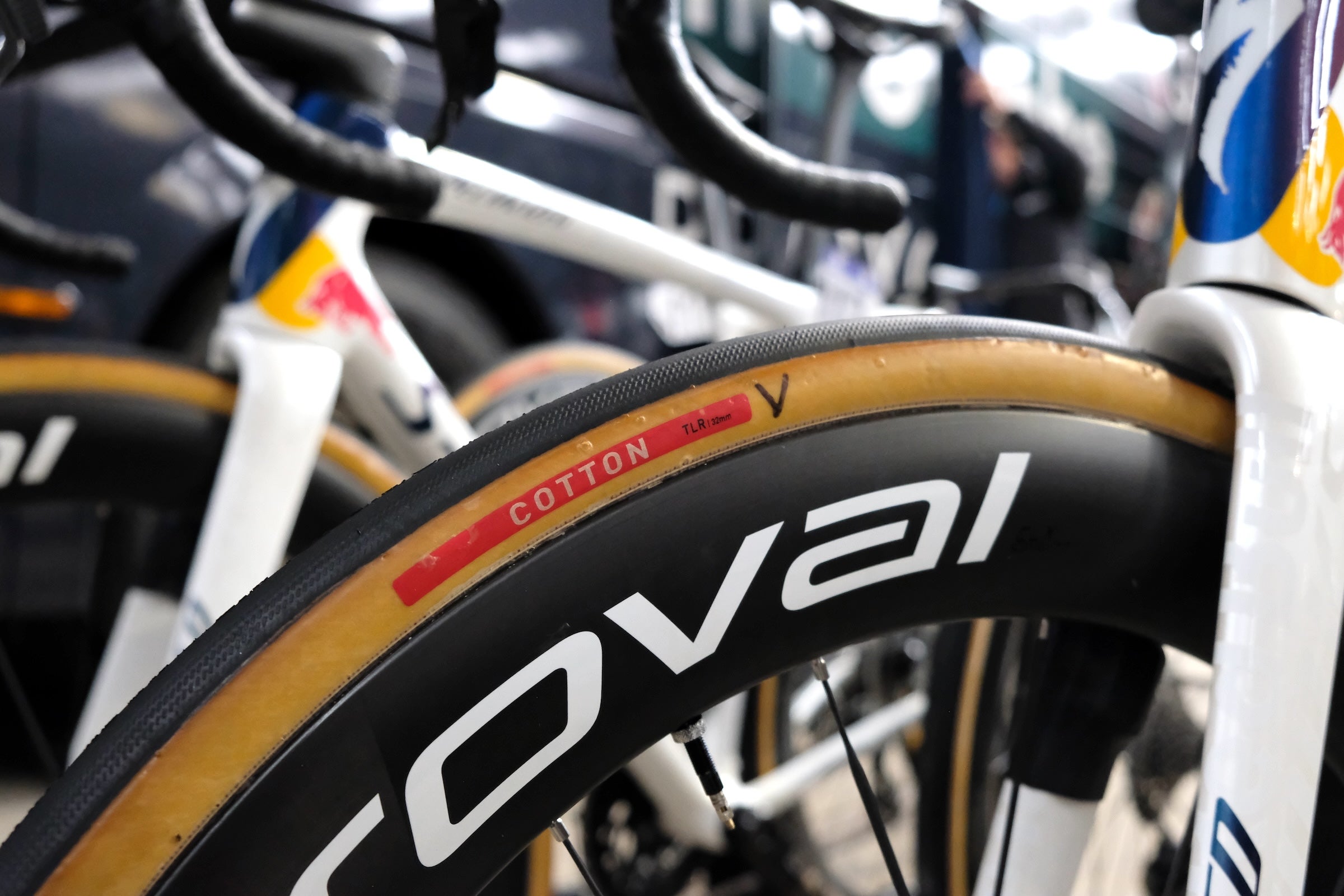 Two teams chose to start with wider tires: Red Bull-Bora-Hansgrohe and Soudal Quick-Step raced on an unbranded 32-millimeter cotton tire from Specialized. Presumably — judging by the familiar thread — it is a new cotton Turbo TLR tire.