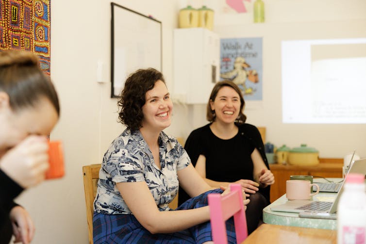 Emily Hart (left) and Margot Lloyd running a Pink Shorts Wordshop.
