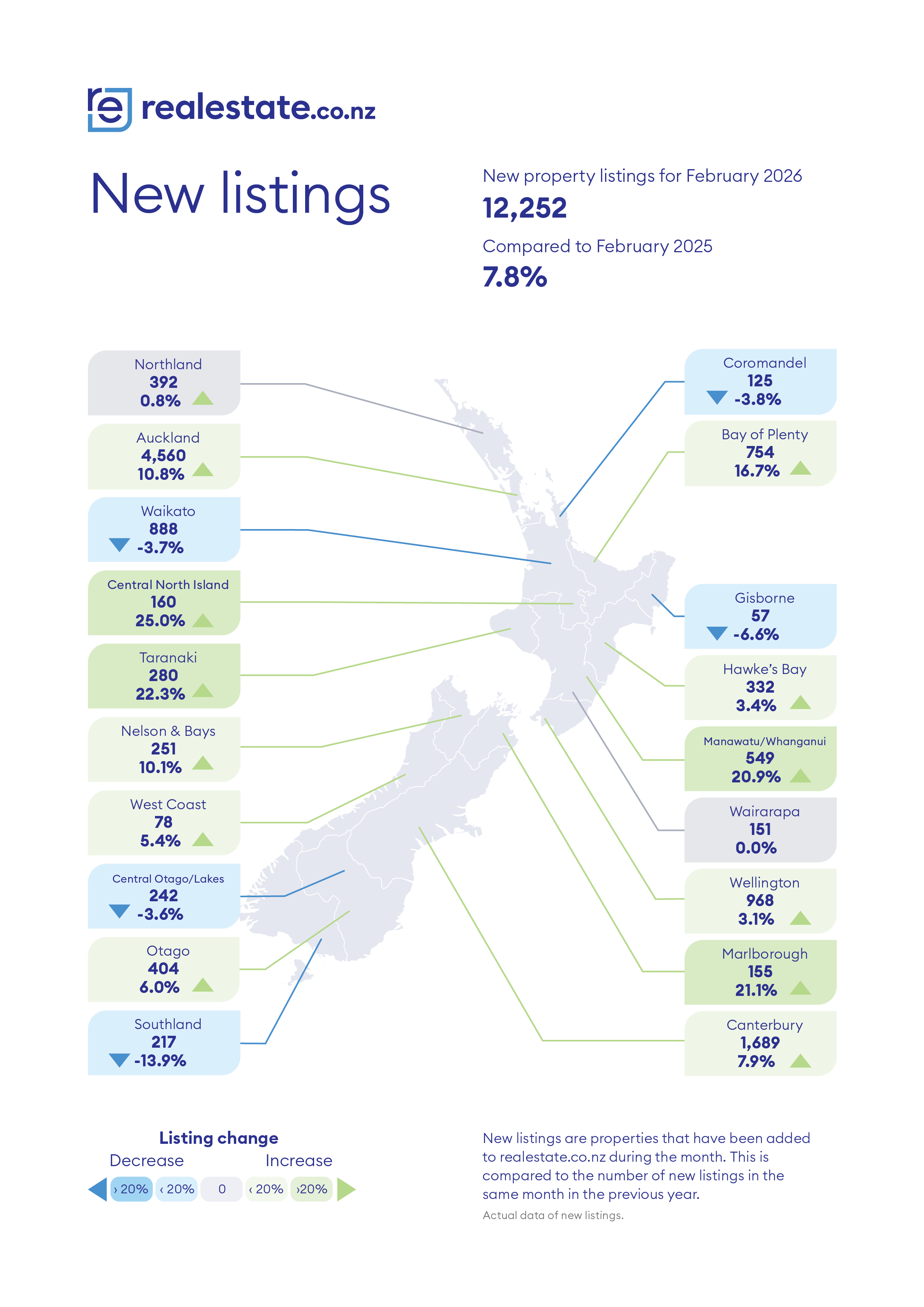 However, buyers in most main centres will also have plenty of choice, with new listings in the Bay of Plenty up 16.7%Â compared to February last year, followed by Auckland 10.8%, Canterbury 7.9% and Otago 6.0%. See the table below for the full regional figures.