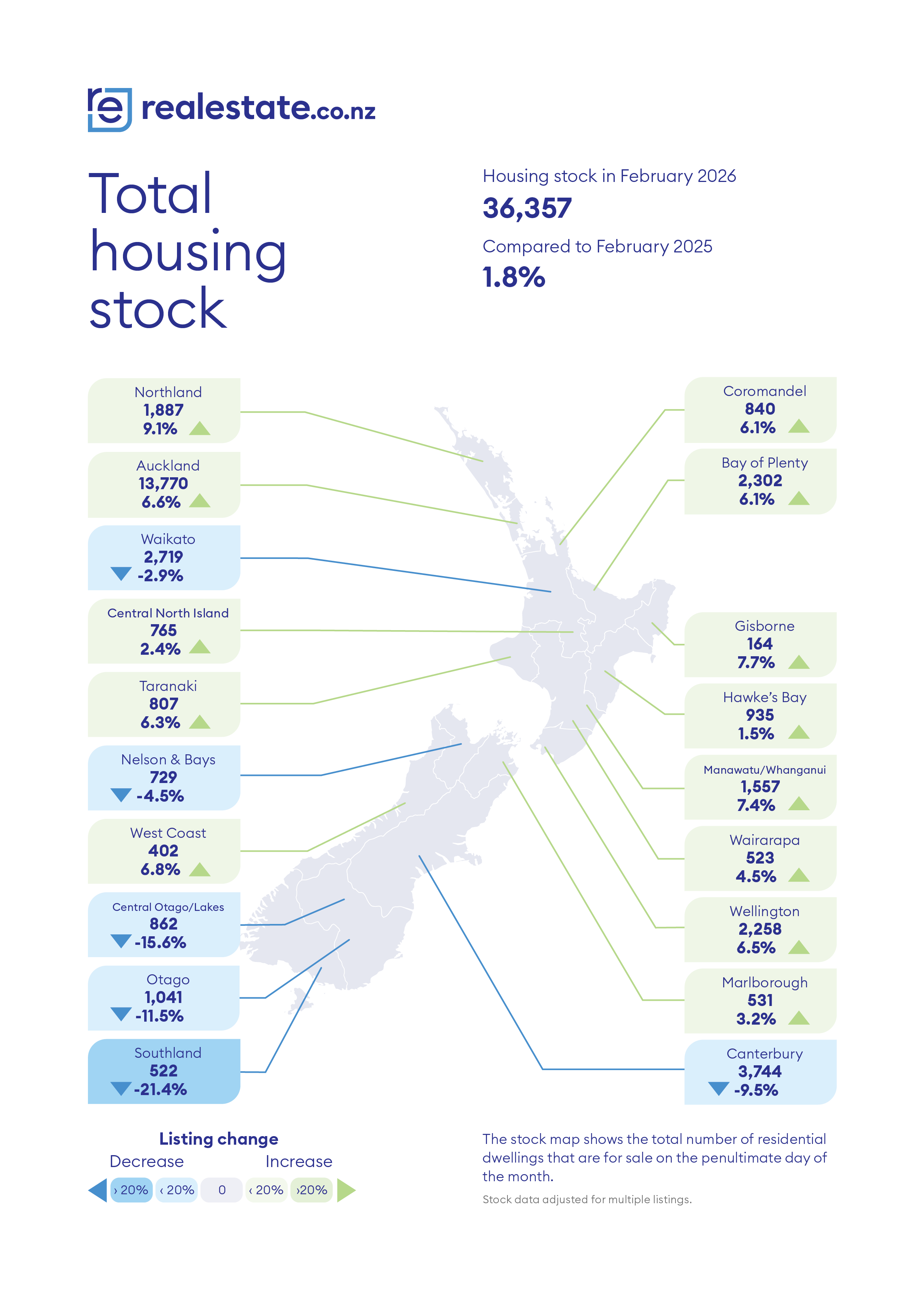 New residential listings and total stock levels on Realestate.co.nz both at their highest levels in more than a decade