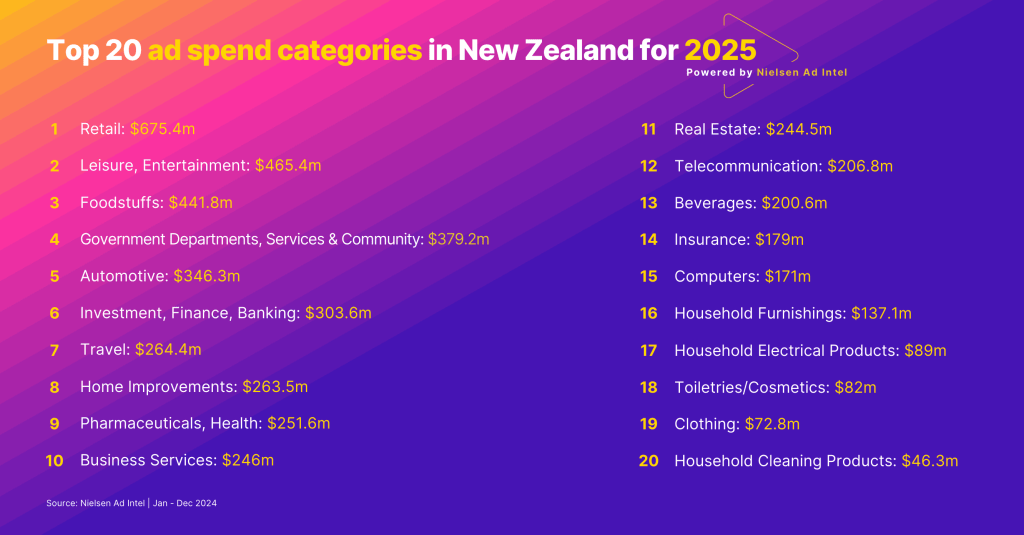 Nielsen’s latest research shows retail remained the clear heavyweight of the New Zealand market, while ad investment strengthened across categories where Kiwis are actively comparing value, switching providers and researching big-ticket purchases.