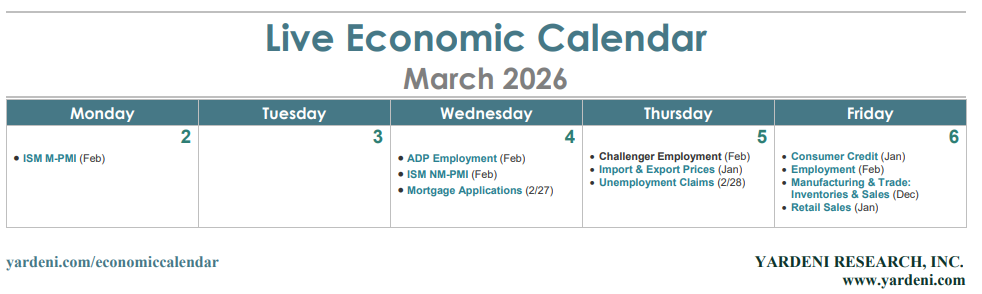 (1) Employment. We expect a 60,000 increase in February payrolls (Fri). The data takes on increasing significance since last month’s surprisingly robust increase of 130,000 and 4.3% jobless rate. Another healthy jobs report could close the door on Fed rate cuts for the foreseeable future. We’ll also get February employment data from ADP (Wed) and Challenger (Thu), as well as initial jobless claims (Thu), which suggests that the jobless rate probably fell again last month (chart).