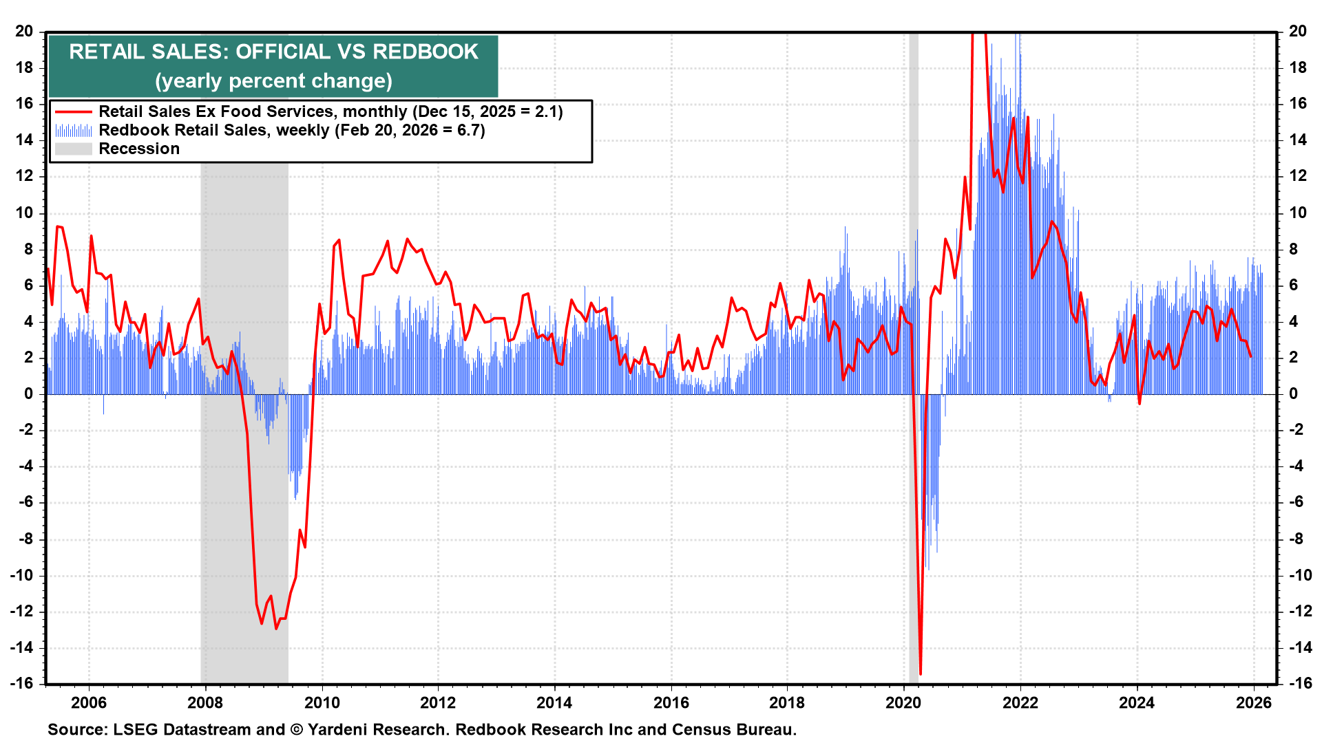 (2) Retail sales. The January retail sales report (Fri) will be an important reality check following a flat December reading. Most forecasts center on a roughly 0.2% m/m drop last month. Still, with employment holding its ground and the stock market near record highs, spending patterns should hold up as well, as confirmed by the weekly Redbook Retail Sales index (chart).