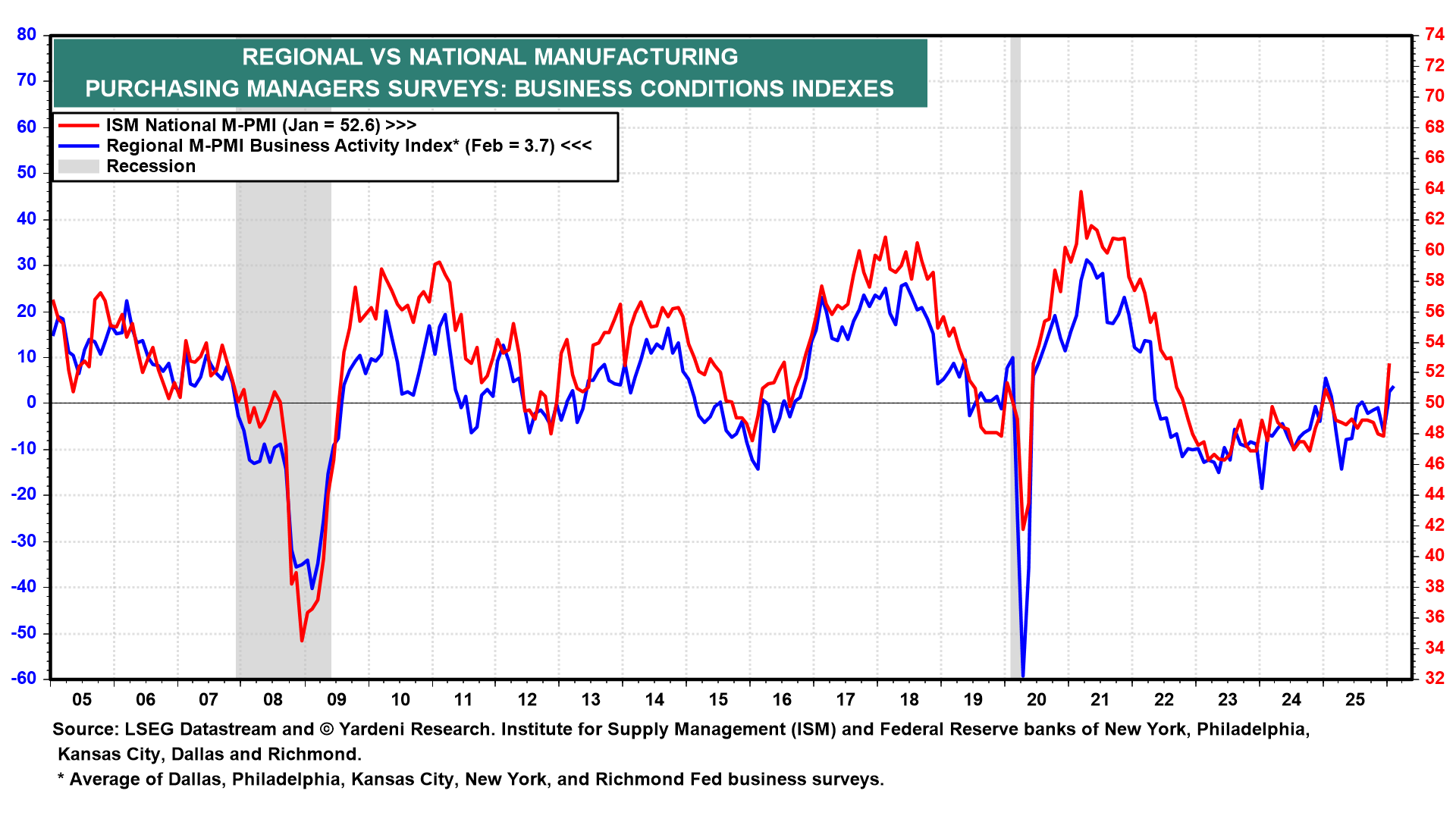 (3) PMIs. The Institute of Supply Management reports its February manufacturing purchasing managers’ index (Mon), which expanded in January to 52.6. The non-manufacturing PMI (Wed) follows. It, too, came in well above 50.0 the previous month, at 53.8. The regional business surveys suggest that M-PMI remained above 50.0 last month (chart).
